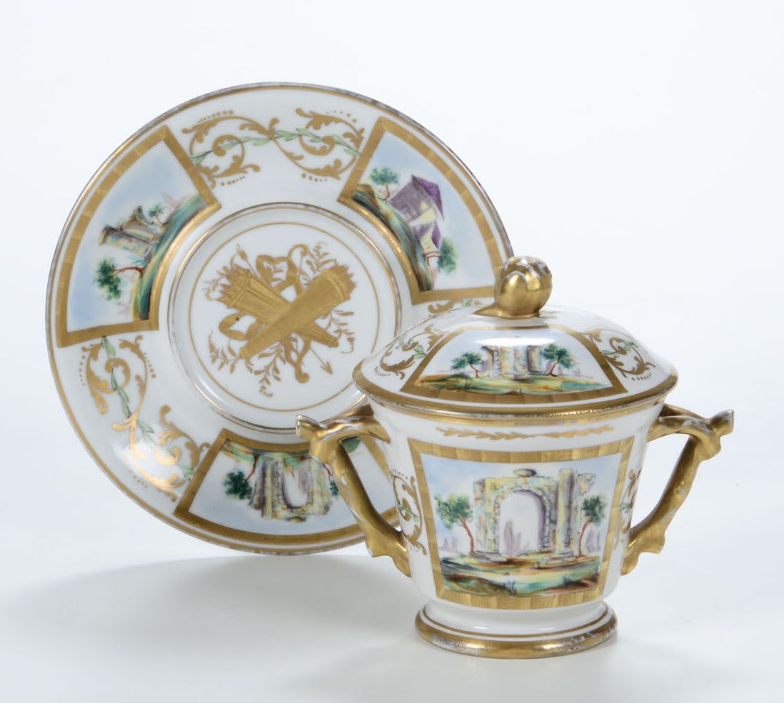 Grande tazza con coperchio e sottopiatto Francia, Limoges (porcellana), XIX secolo Decorazione eseguita da un pittore ind [..]