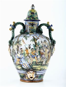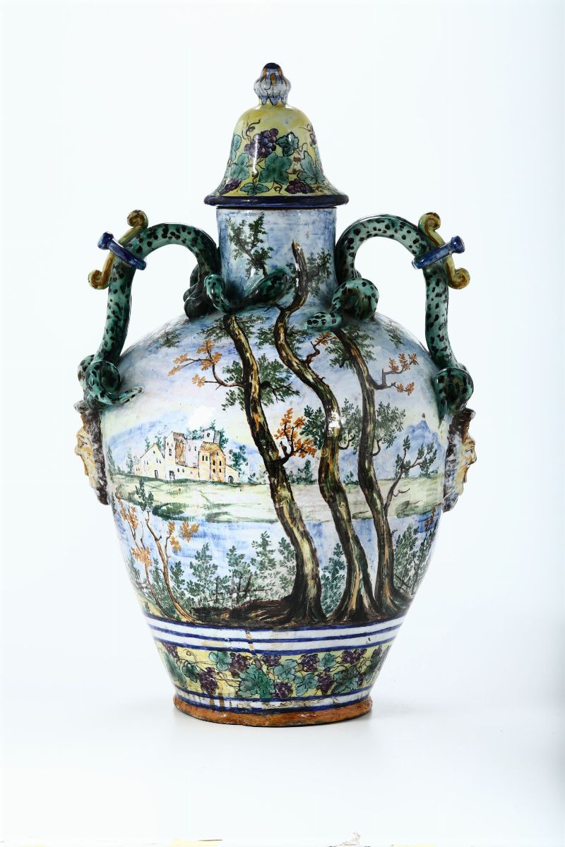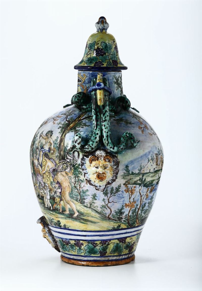 Il vaso, biansato e con coperchio, è a forma di stagnone ed è decorato sul recto con un baccanale in policromia con numerosi personaggi ed inoltre da uno stemma nobiliare. Sul verso paesaggio. Sia l’appoggio dei manici a serpenti che il foro inferiore per inserire il rubinetto, sono a mascherone