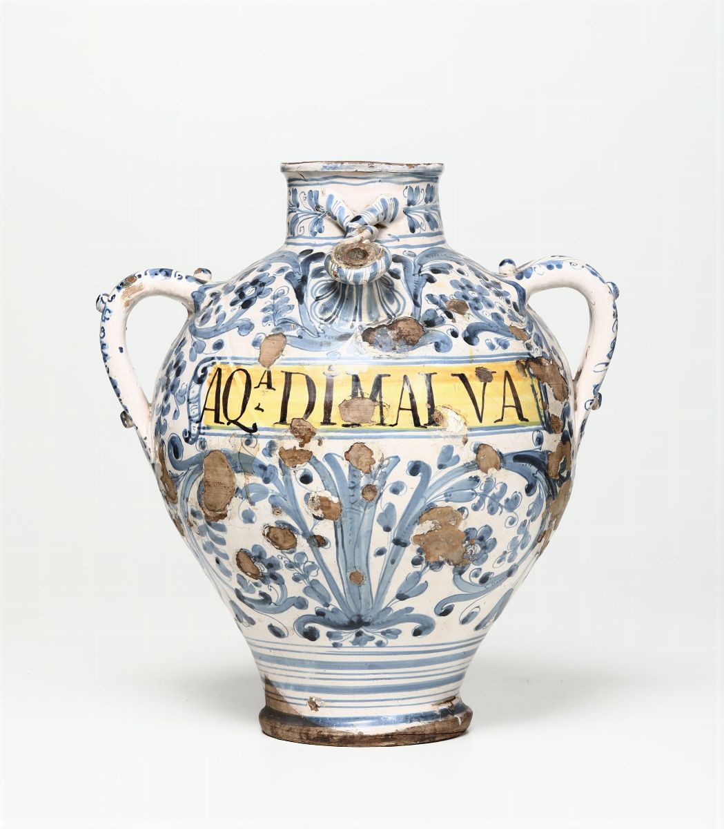 Sia la forma che la decorazione si ispirano ai vasi da farmacia seicenteschi. La decorazione è a rami fioriti calligrafici e un cartiglio giallo con la scritta “AQA DIMALVA”
