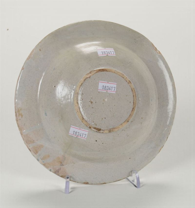 Maiolica. Marca: assente. Altezza cm 4,5; diametro cm 20. Rotto in diversi frammenti e ricomposto in restauro con integrazioni