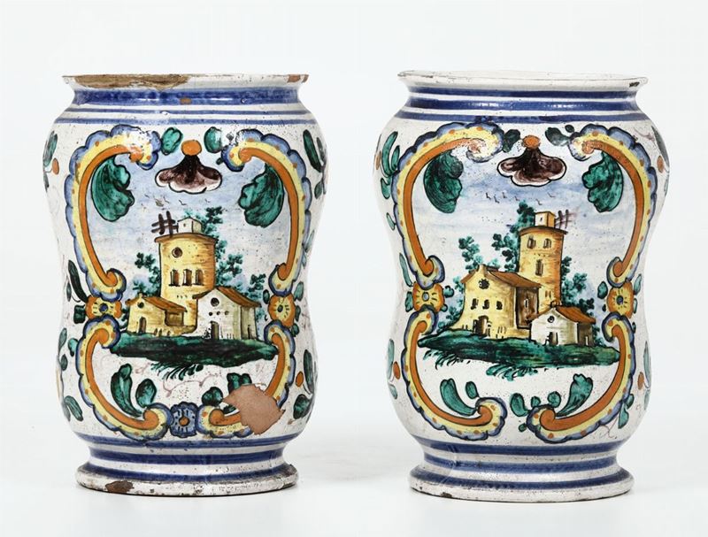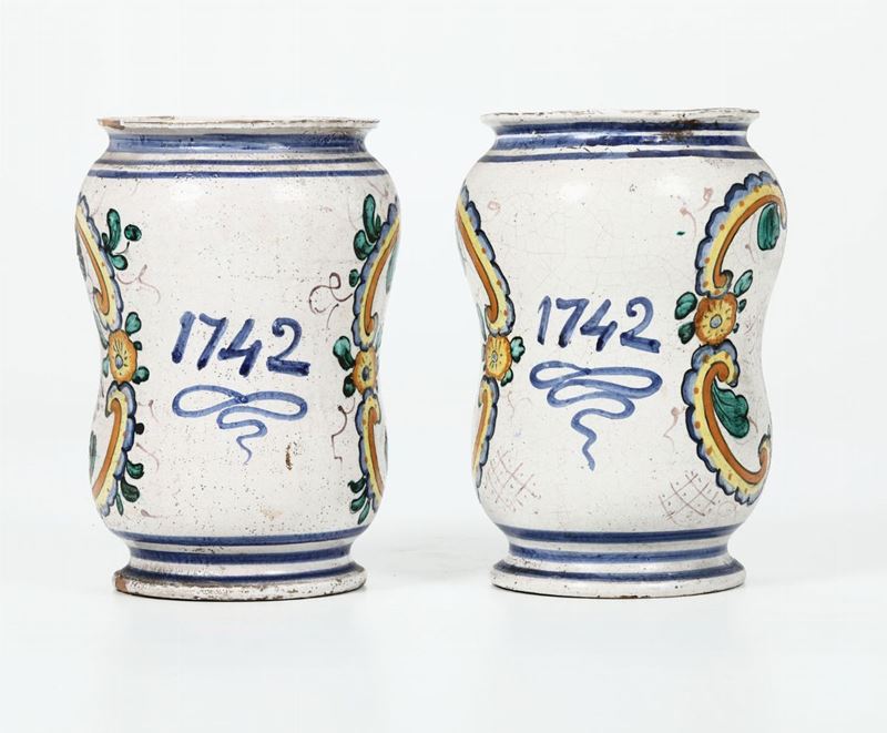 1 Coppia di albarelli in maiolica alla maniera di Napoli del Settecento, con data 1742 (alt. cm 26; minime sbeccature)
