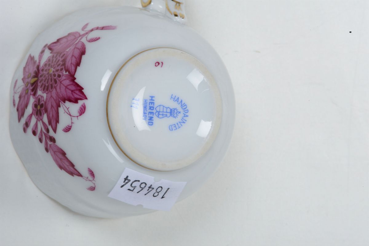 Porcellana rosso porpora e oro. Marca: stemma, “Handpaited” “Herend Hungary”. Alt. tazza cm 4,8; diam. piattino cm 11,5. Perfetto stato