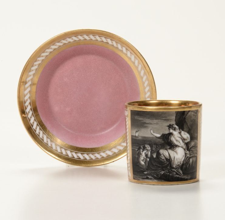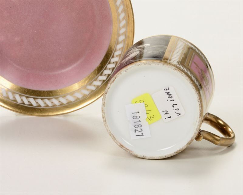 La tazza è cilindrica con manico e il piattino troncoconico. Sul fondo rosa della tazza sono ricavate tre riserve rettangolari, le due laterali con motivo a trofei e quella centrale con una scena in grisaille. Ai bordi fascia con nastro geometrizzato e intrecciato su fondo oro