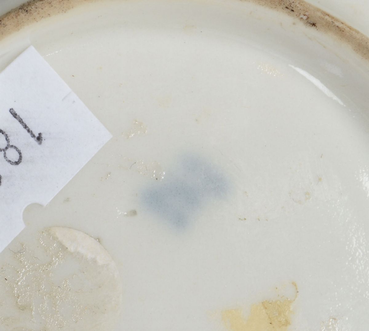 Porcellana. Marca: “Z” in blu. Altezza tazza cm 4,2; diametro piattino cm 13,2. Alcune minime sbeccature ai bordi superiore ed inferiore della tazza