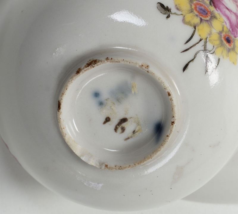La tazza senza manico ed il piattino sono decorati in policromia con un delicato mazzo di fiori europei e ramoscelli sparsi