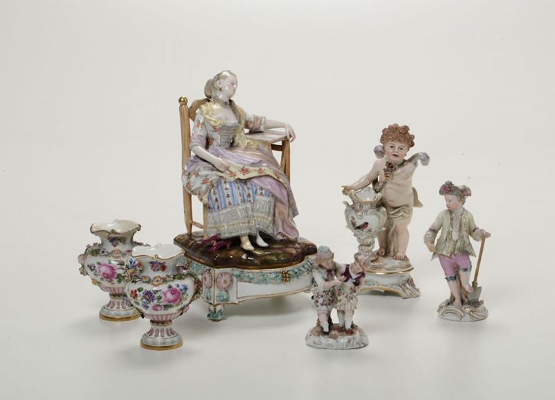 Tre figurine e coppia di vasetti Meissen, XVIII e XIX secolo