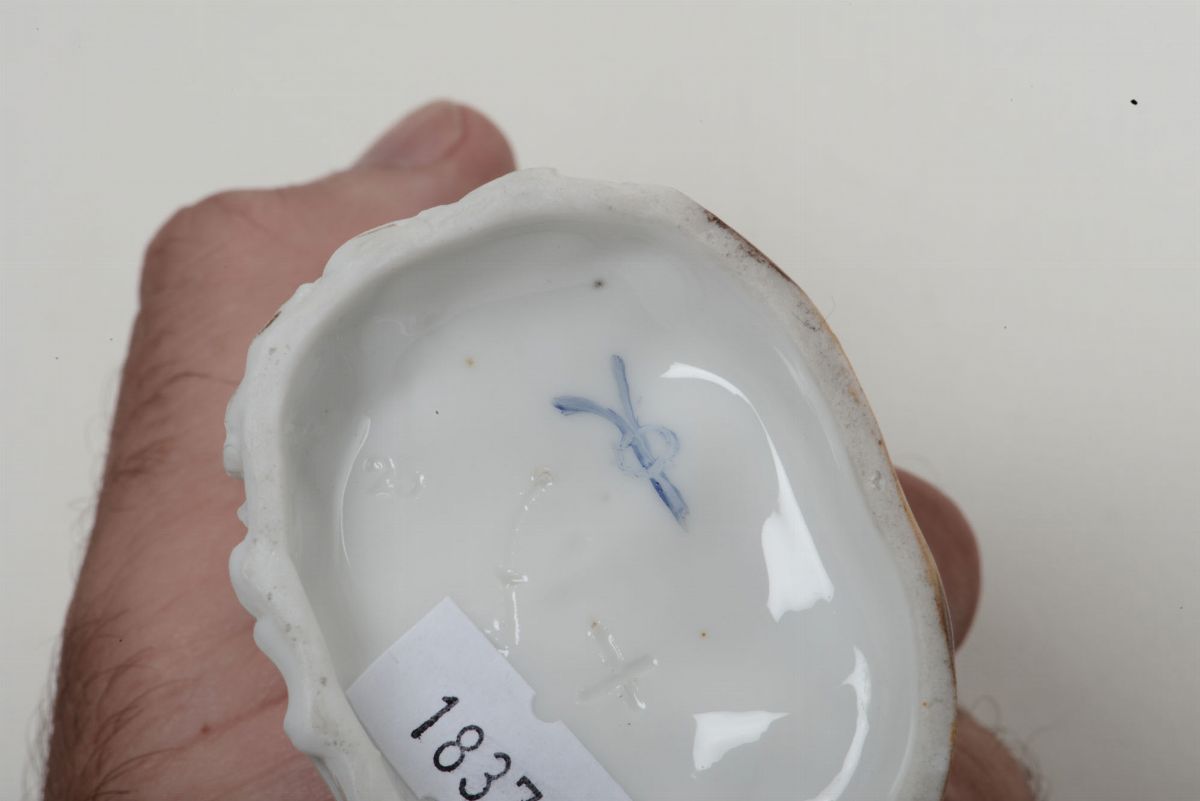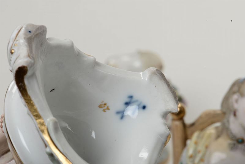 Figurina di putto alato con cratere, XIX secolo. Marca: spade in blu; “P119” inciso. Alt. cm 18,3. Una mano restaurata, piccole sbeccature