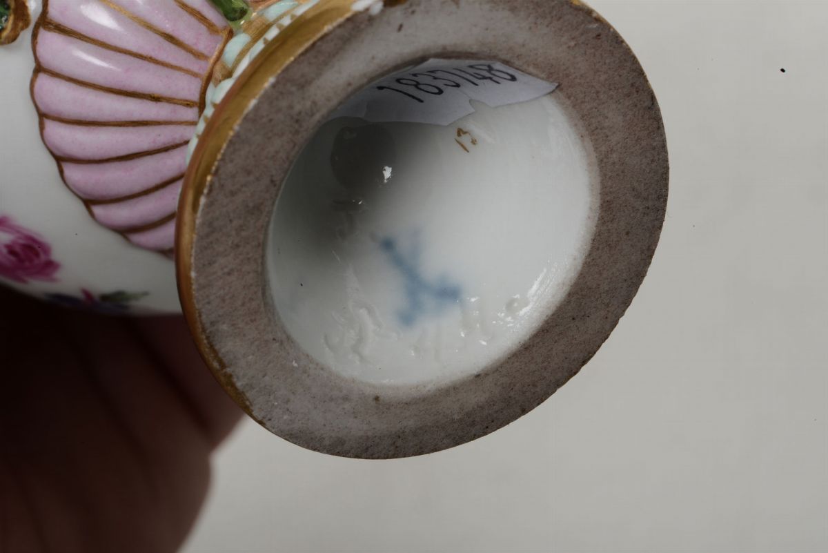Coppia di vasetti, XIX secolo Marca: spade in blu, “A44” inciso. Alt. cm 9,8. Vecchio restauro ad un pezzo; rotture ai fiori