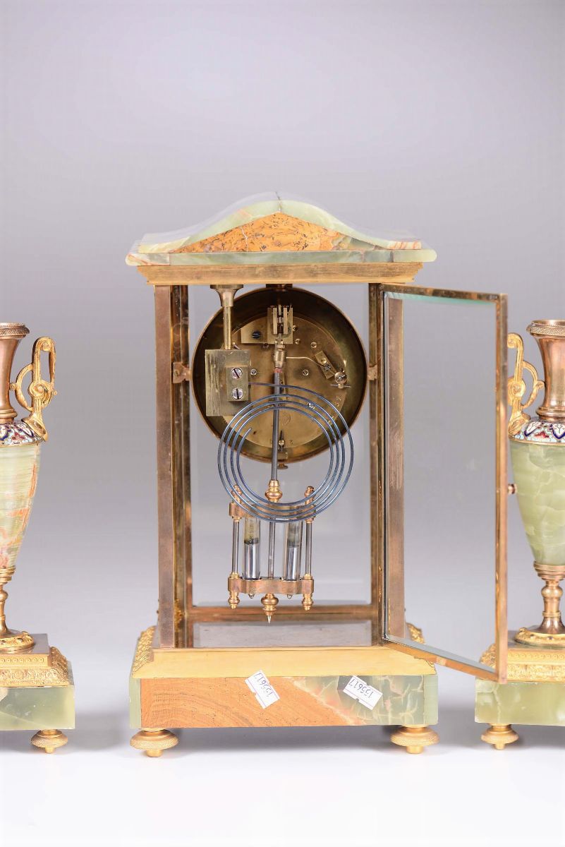 composto da orologio e coppia di vasi biansati. Orologio con quadrante a numerazione araba in nero circondati da festoni floreali; colonne con smalti cloisonnè e capitelli dorati. Scappamento ad ancora e pendolo a mercurio, suoneria delle ore e mezze al passaggio.