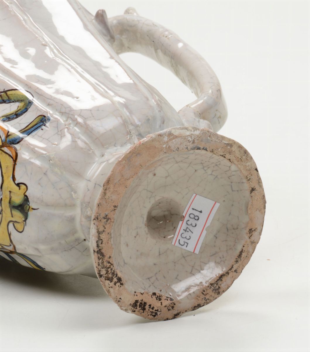 Maiolica policroma a gran fuoco. Altezza cm 18,5. Rotto in più frammenti e ricomposto in restauro; parte superiore e superficie d’attacco del manico integrati