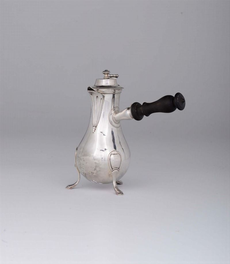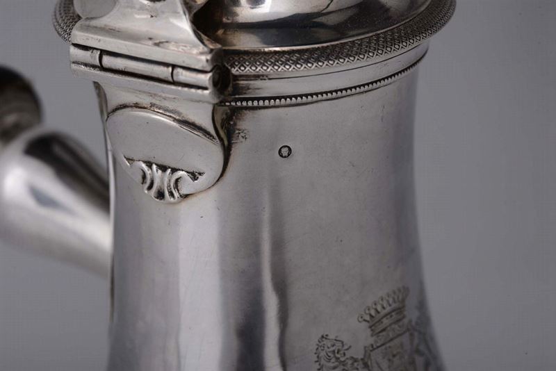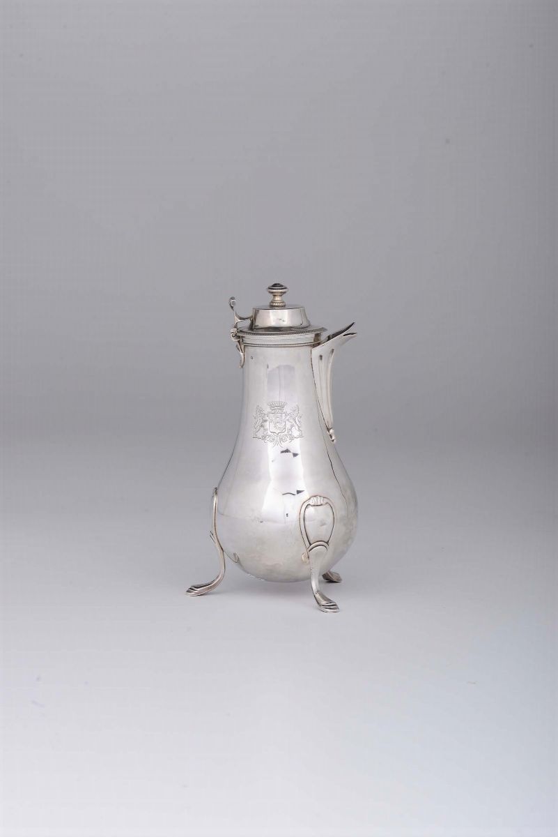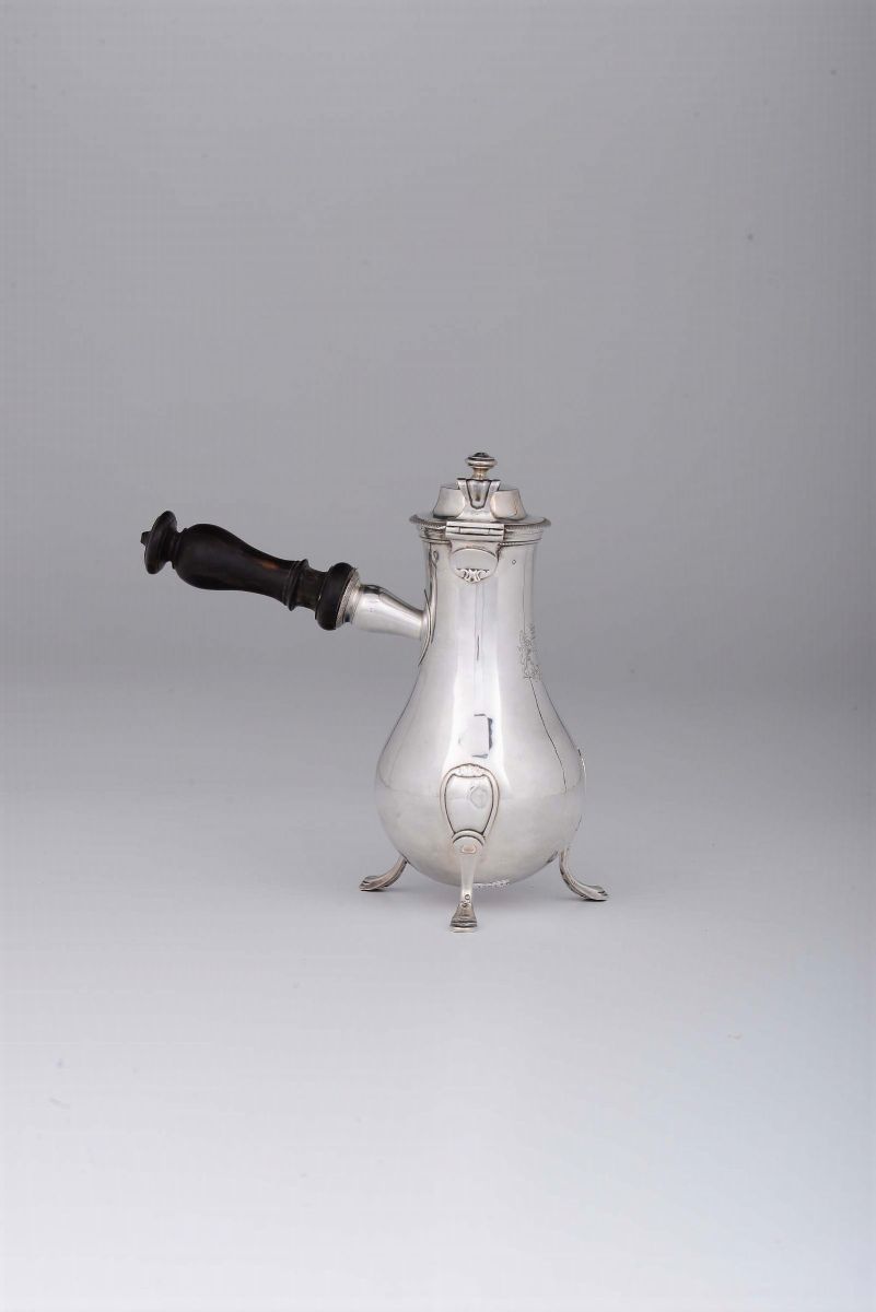 Corpo piriforme poggiante su tre piedini a zoccolo, alto beccuccio laterale scanalato e manico in legno tornito, stemma nobiliare inciso
