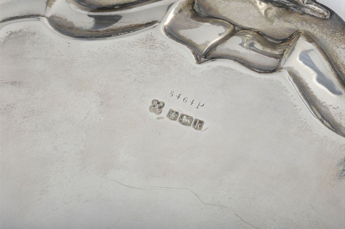 bordo sagomato e decorato a con conchiglie e volute susseguenti dedica incisa al centro del piatto, gr. 800, diametro cm 32