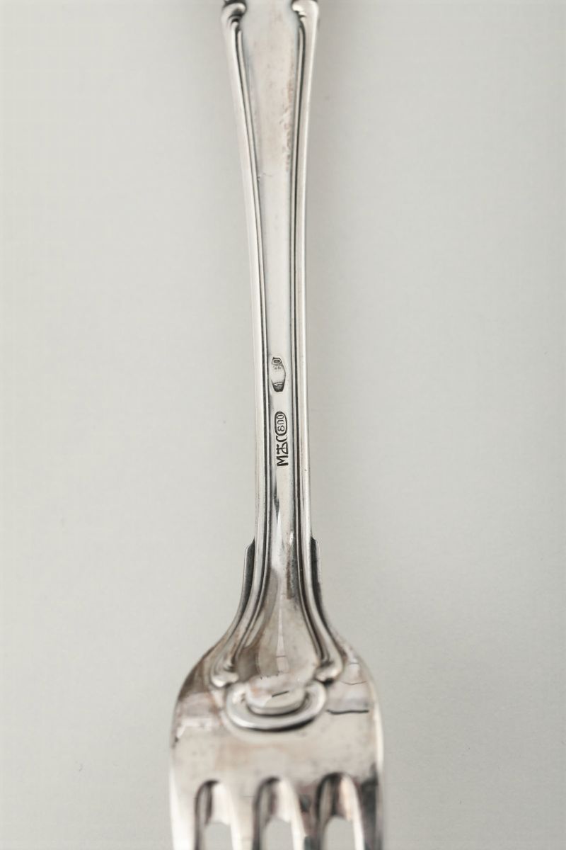 Set di tre posate in argento in custodia Clementi Bologna XX secolo