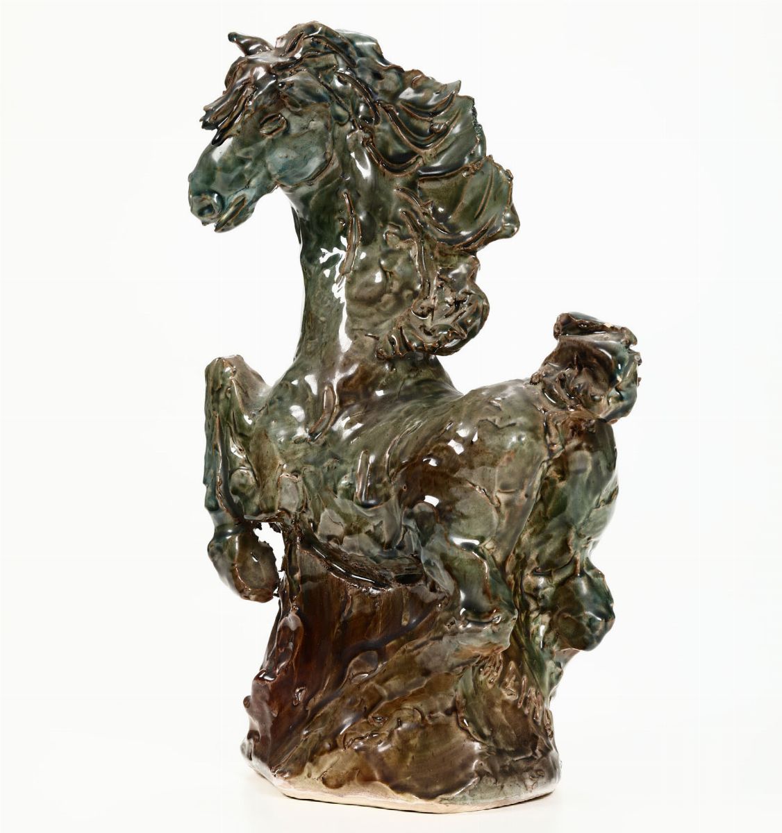 Figura di cavallo in corsa in maiolica smaltata policroma.