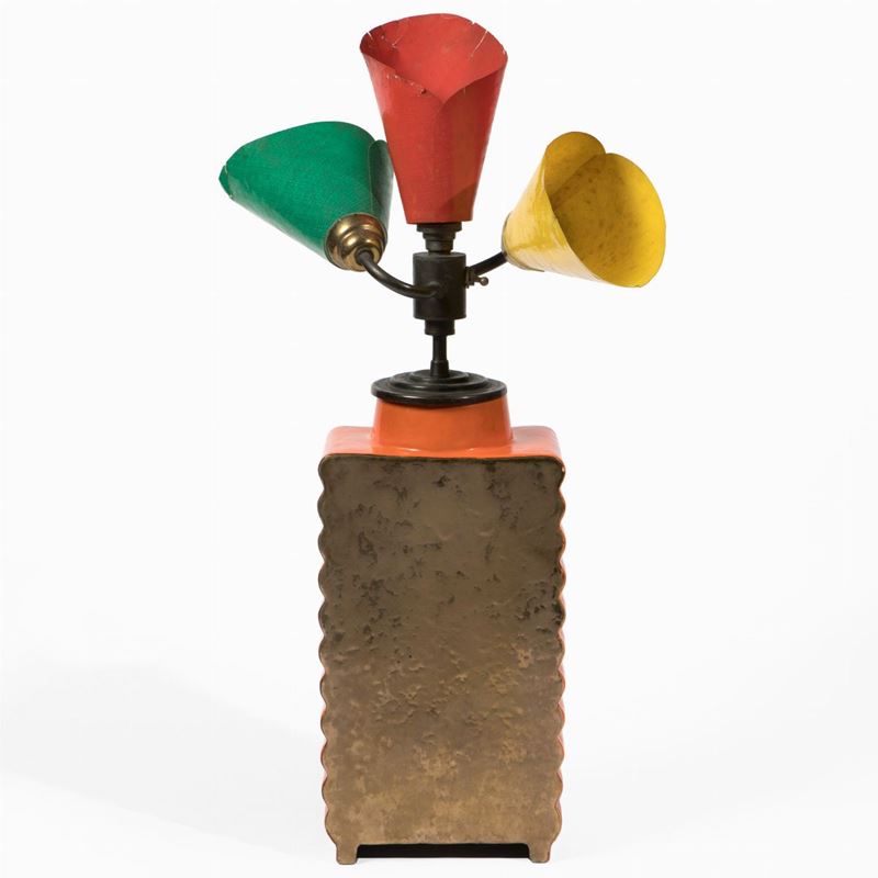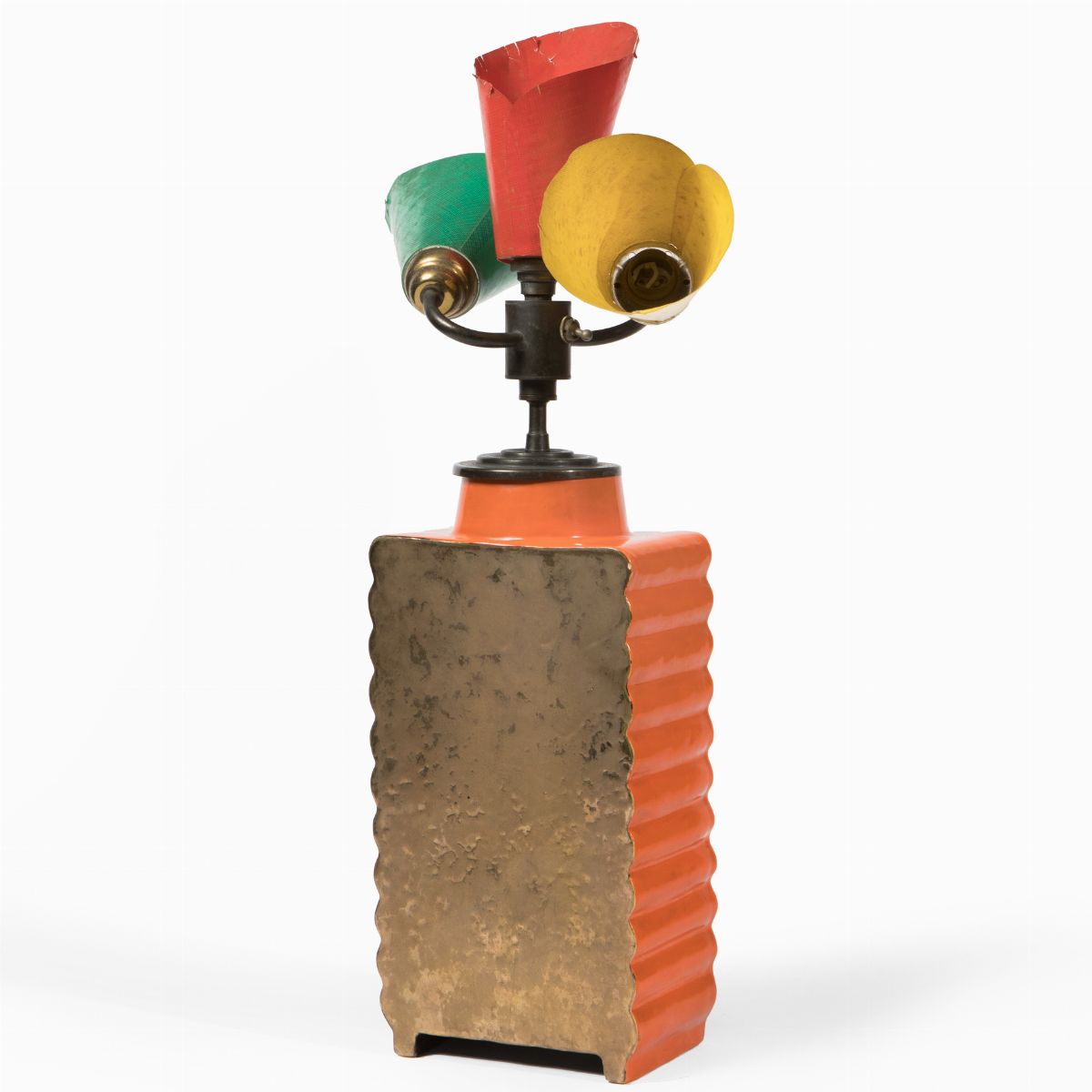 Vaso in ceramica a colaggio a smalto bicolore montato a lampada con diffusori in lamiera colorata.