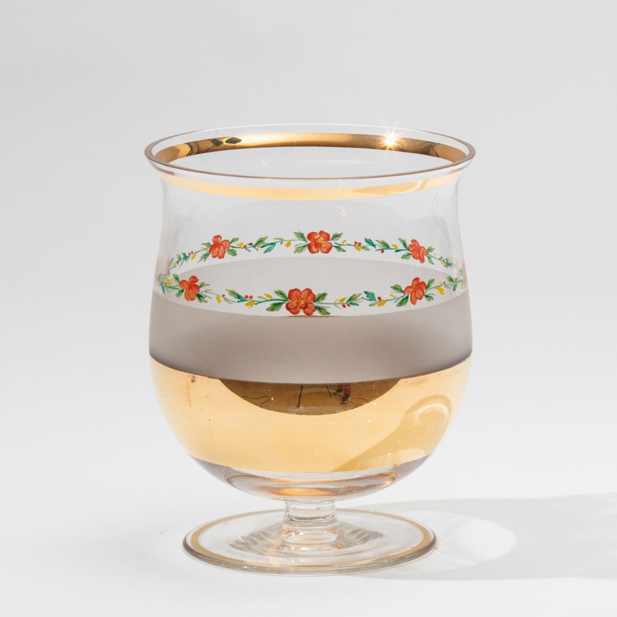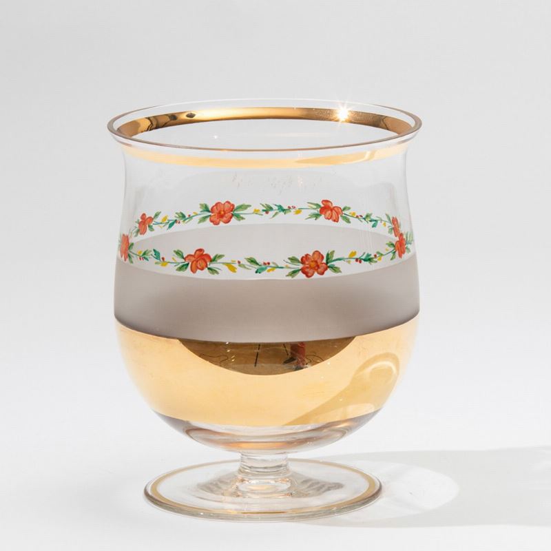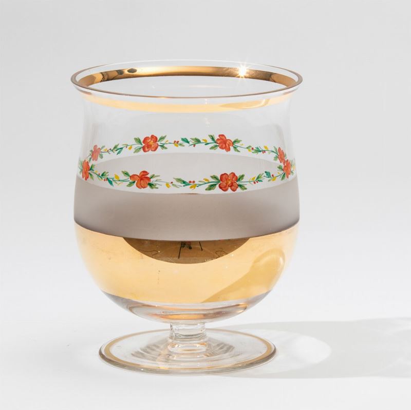 Coppa su piede in vetro trasparente con decoro di fasce oro, sabbiata e floreale a smalto.