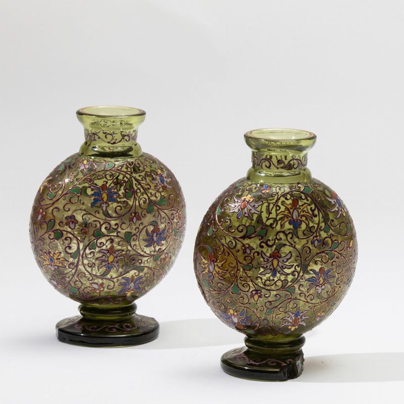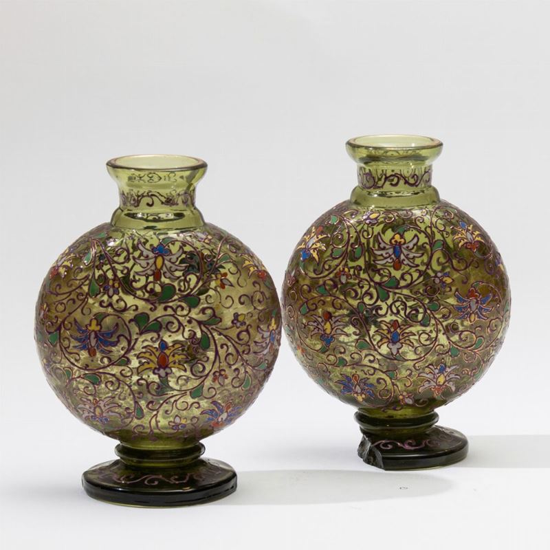 Coppia di vasetti in vetro con decoro a smalto floreale.