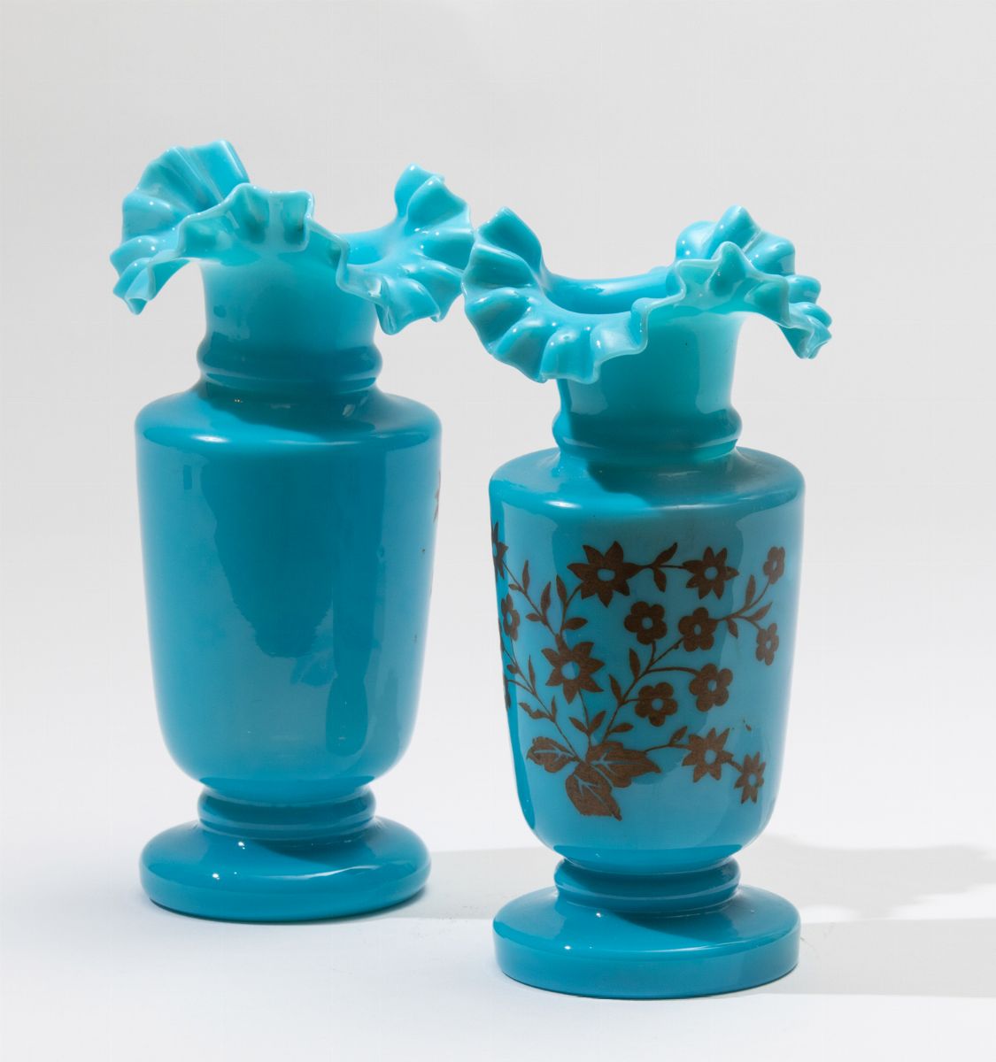 Coppia di vasi in vetro turchese con decoro floreale.