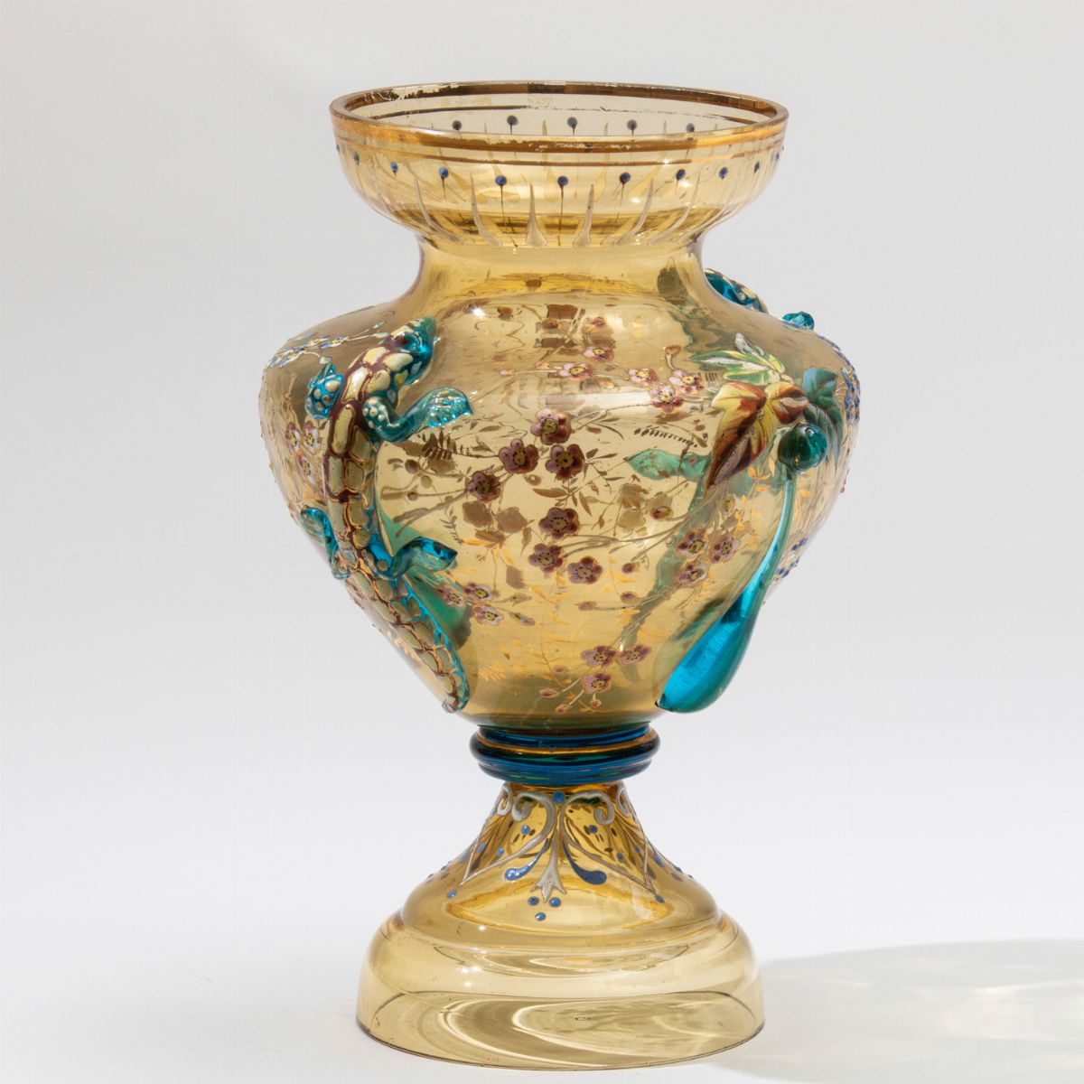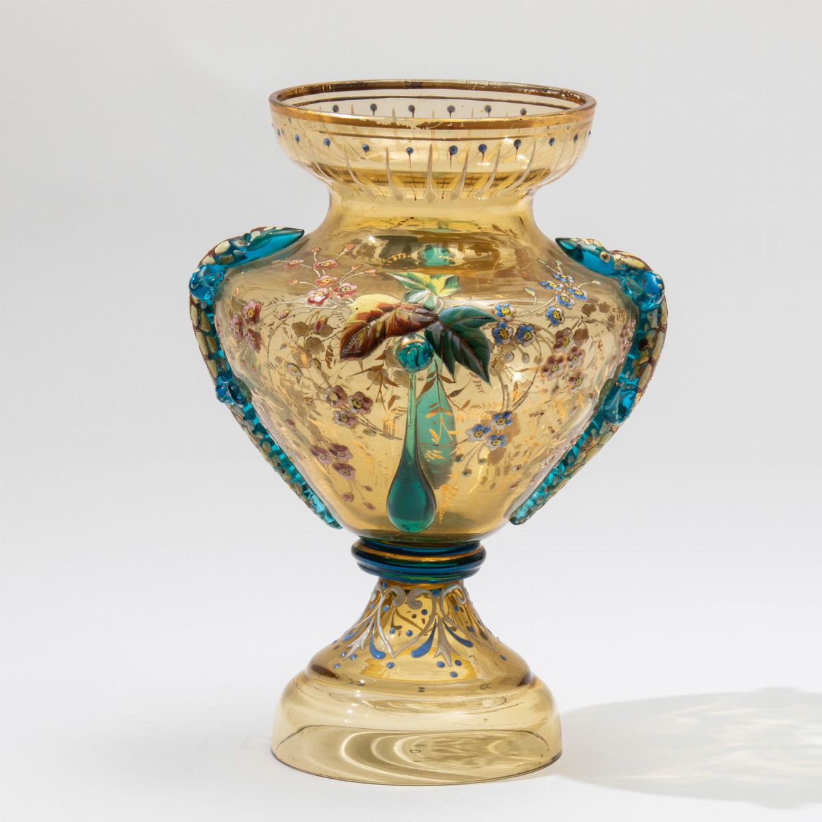 Vaso a balaustro in vetro pagliesco con decoro floreale a smalto policromo e applicazioni in vetro.