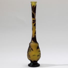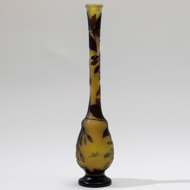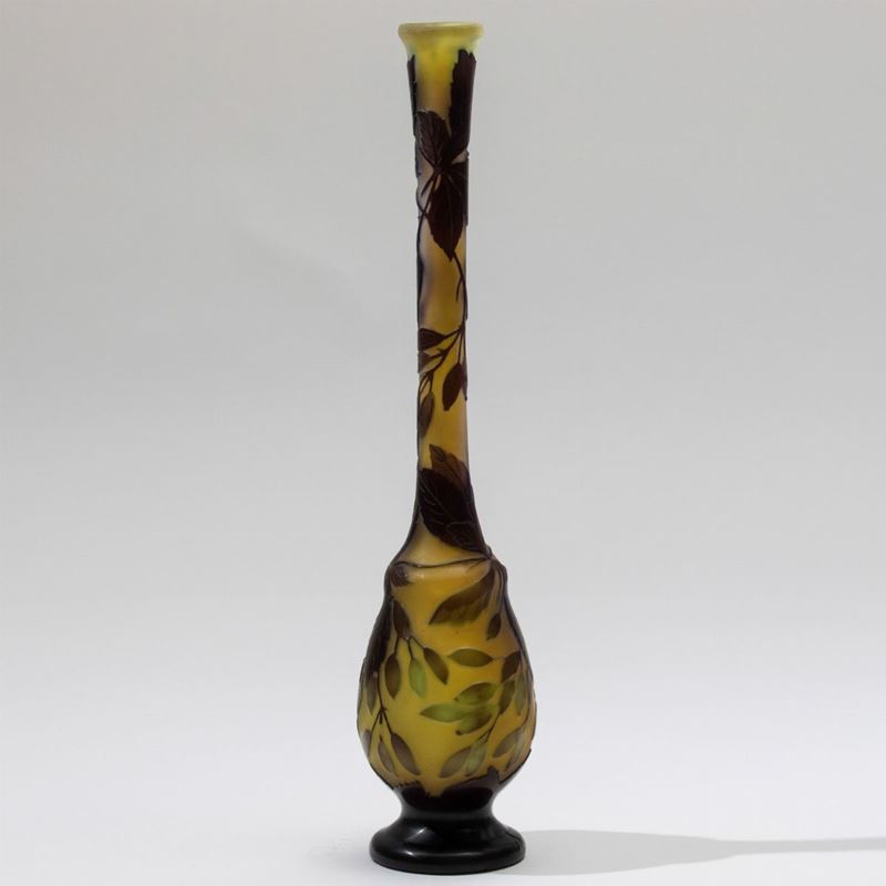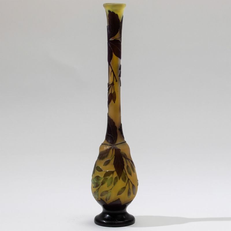 Vaso con alto collo in vetro a cammeo con decoro floreale.