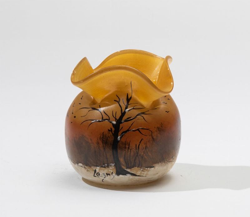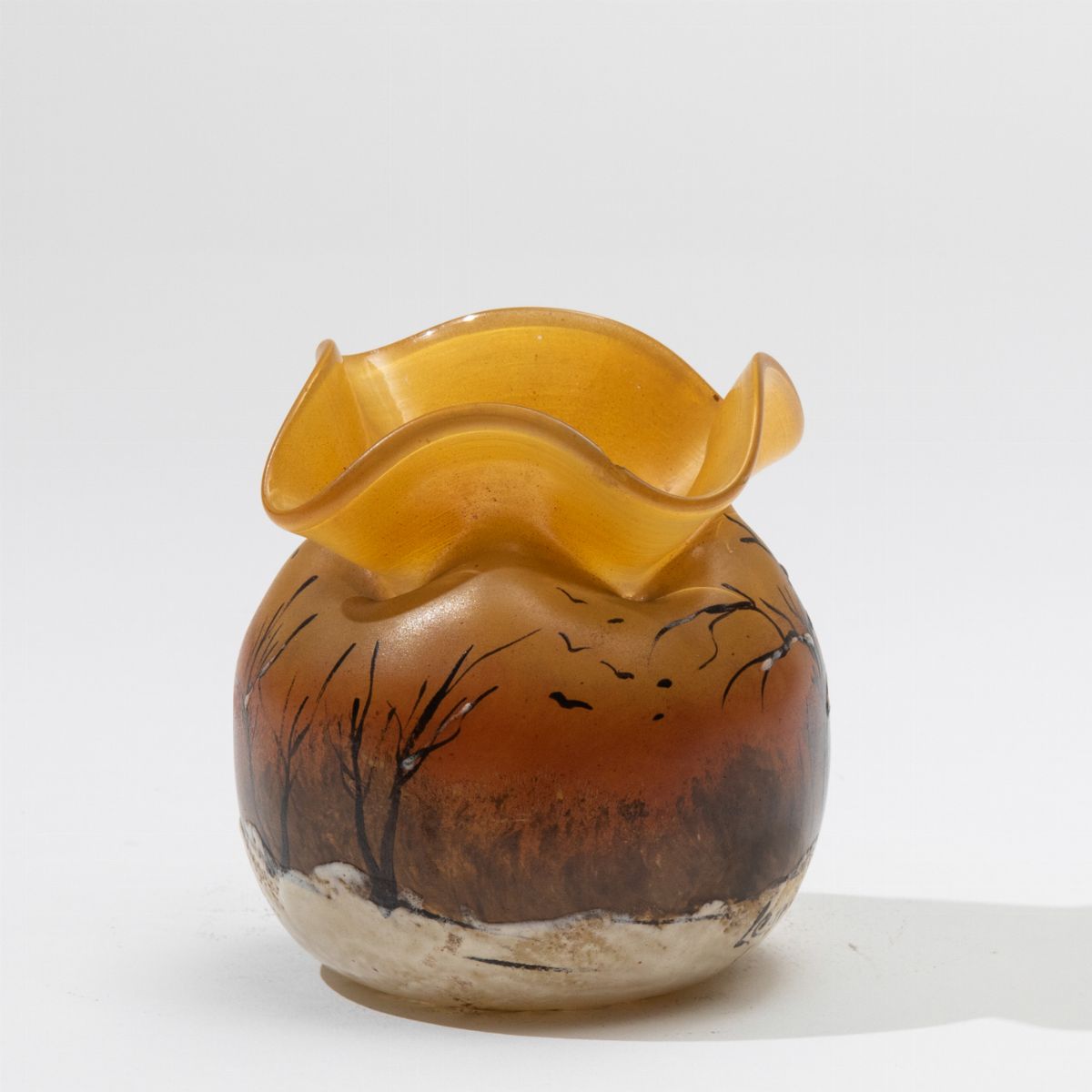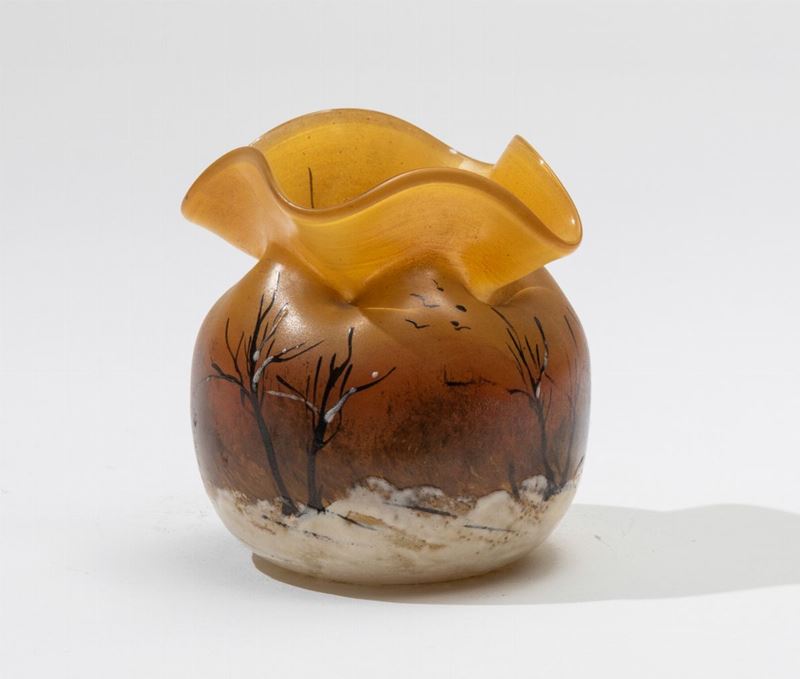 Vasetto in vetro con collo svasato e decoro a smalto di paesaggio invernale.