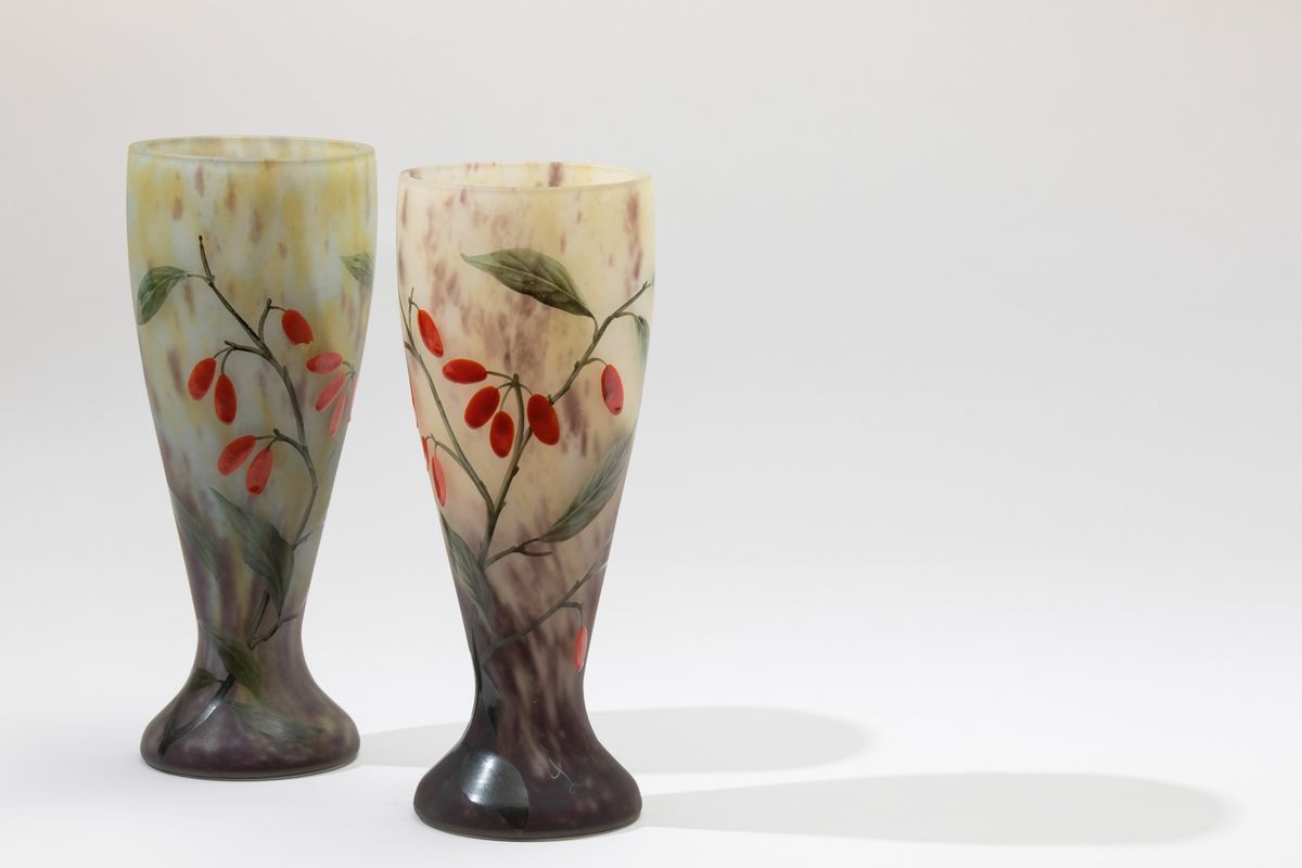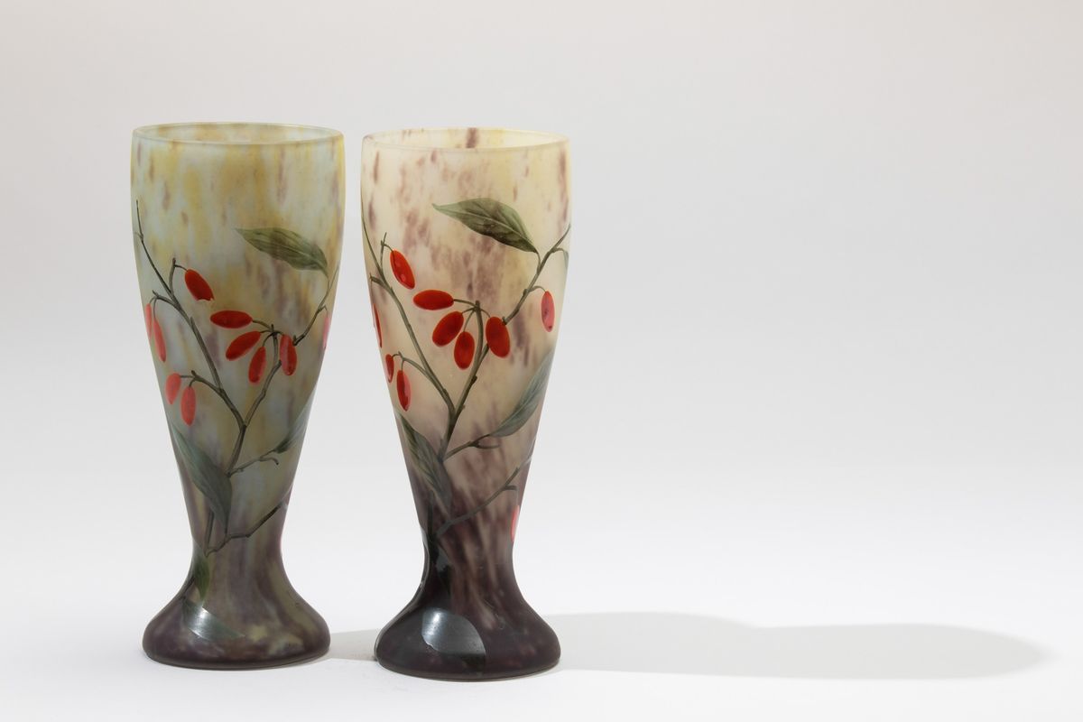 Coppia di vasi in vetro screziato con decoro floreale a smalto.