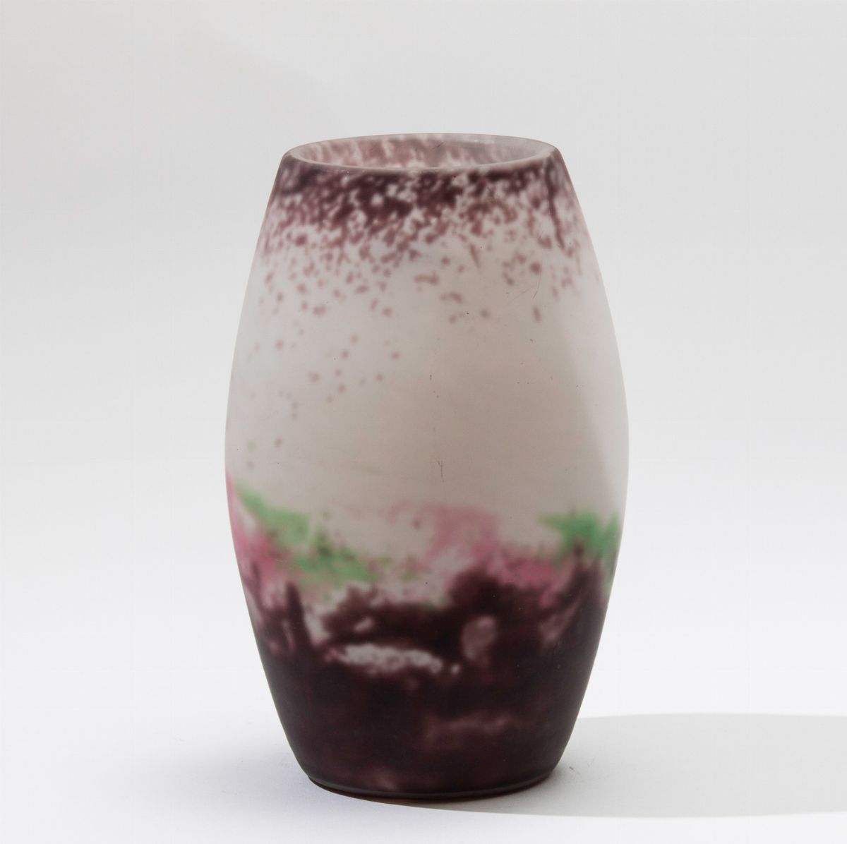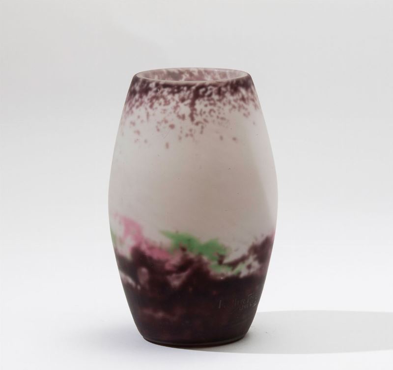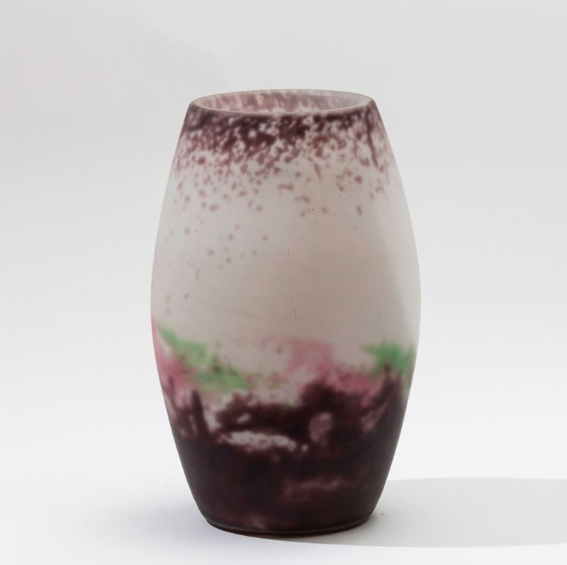 Vaso in vetro sabbiato con decoro multicolore.