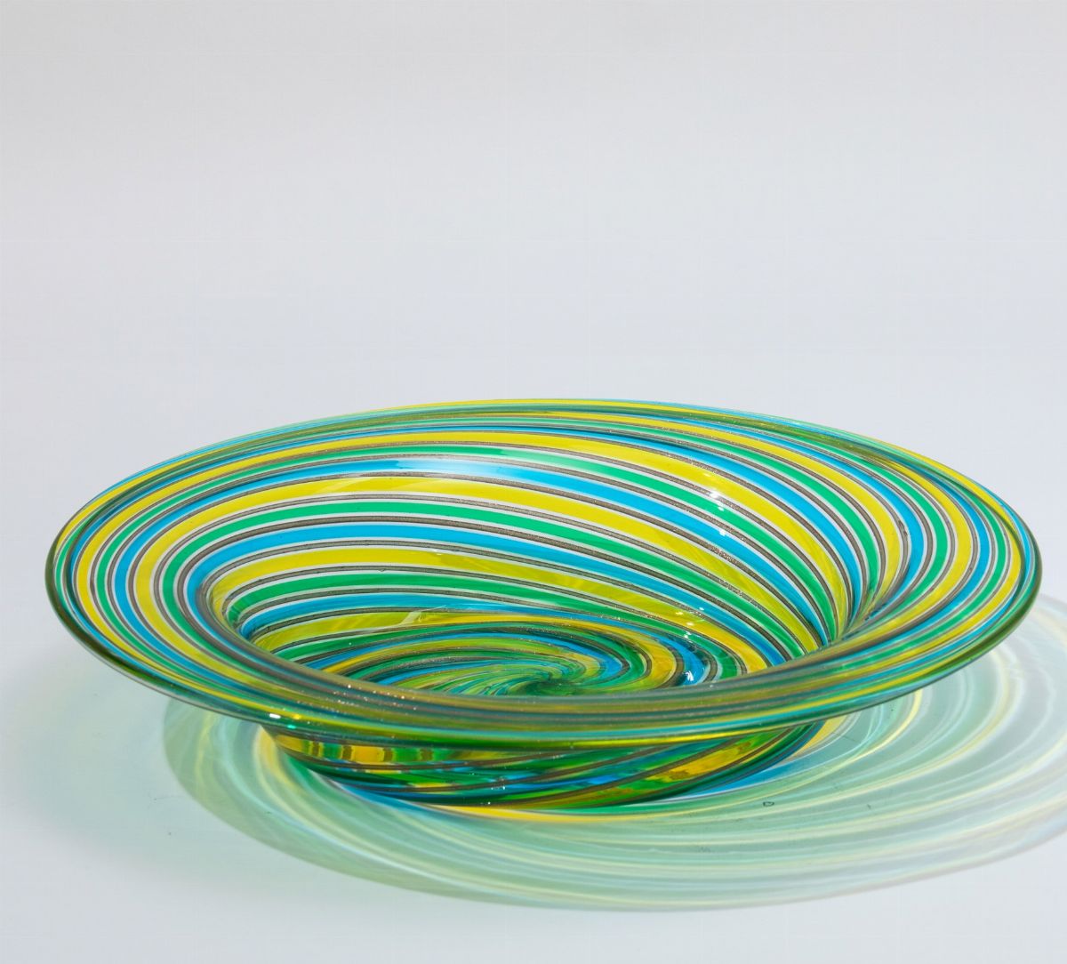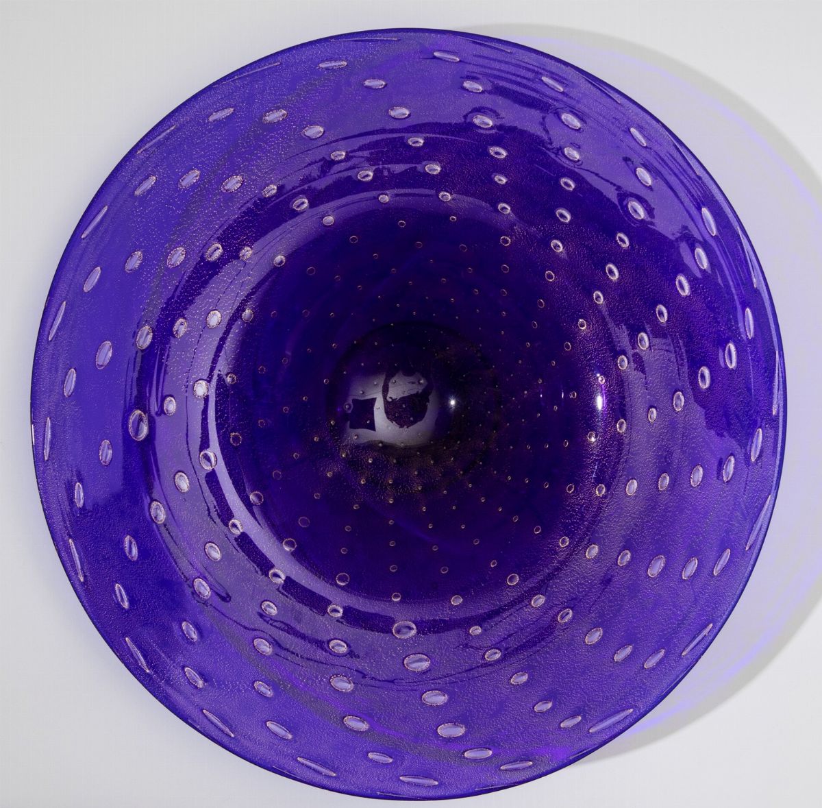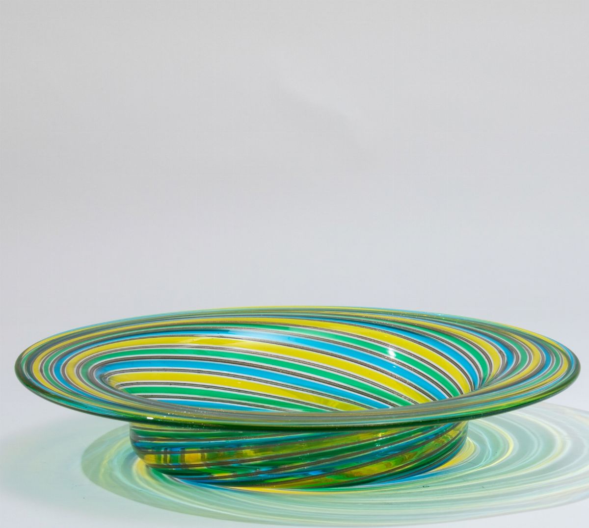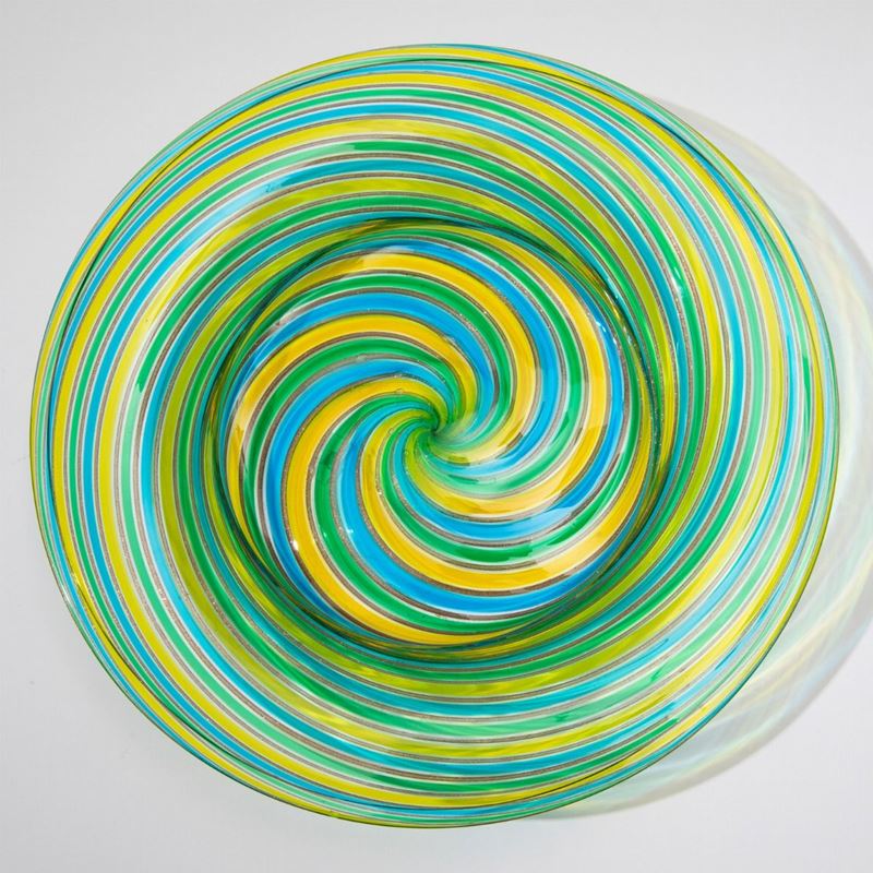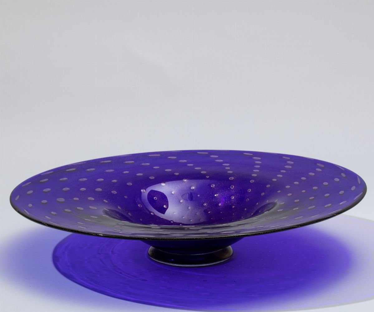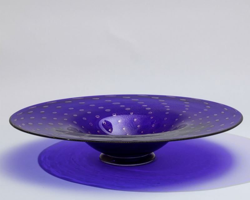 Lotto composto da una coppa in vetro soffiato con decoro di canne policrome e una coppa in vetro soffiato blu con decoro di avventurina
