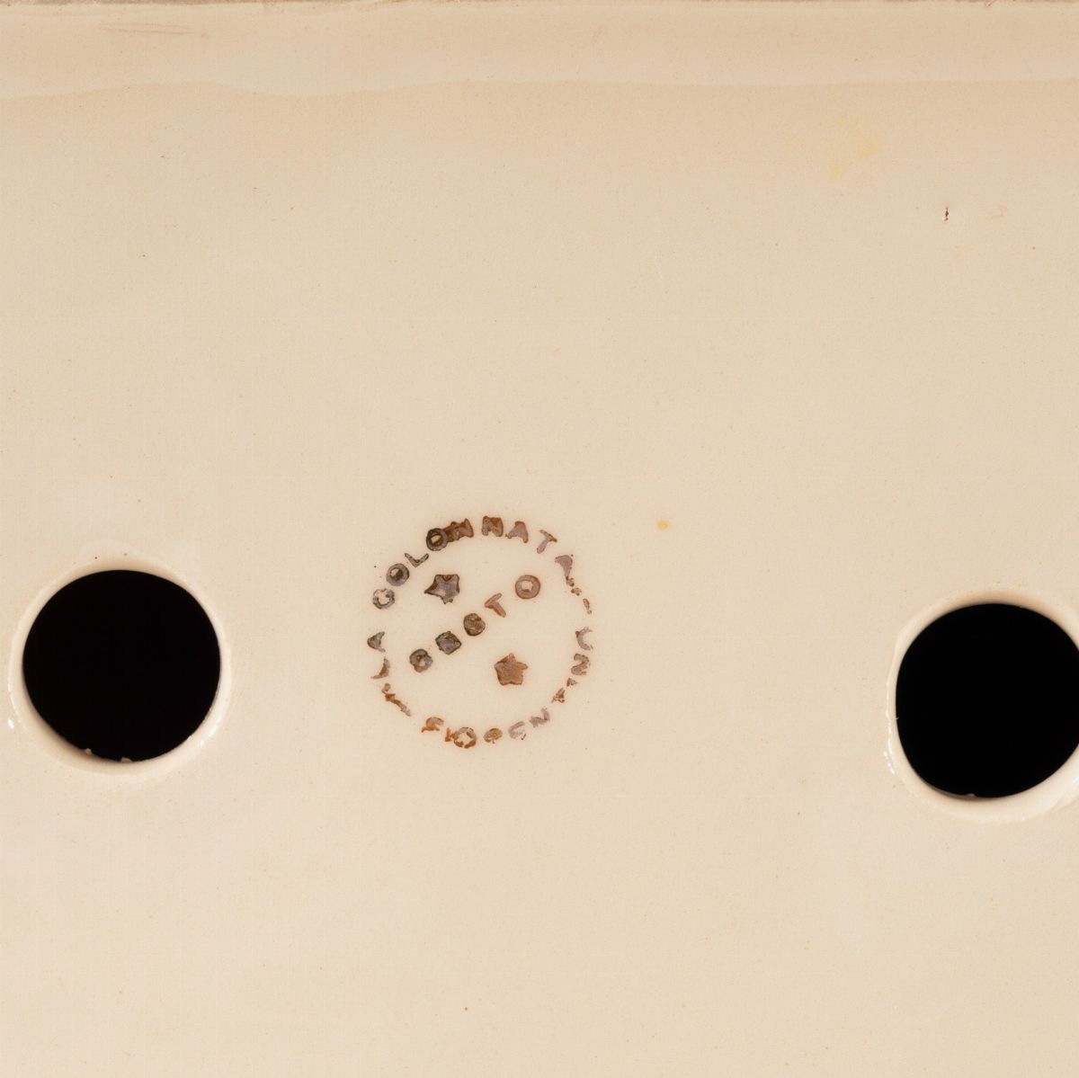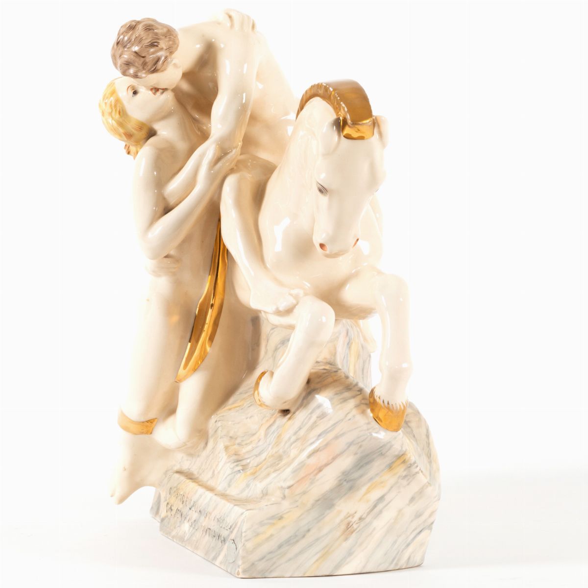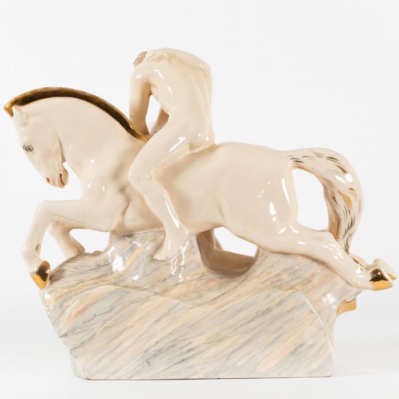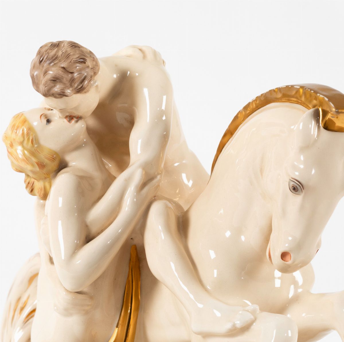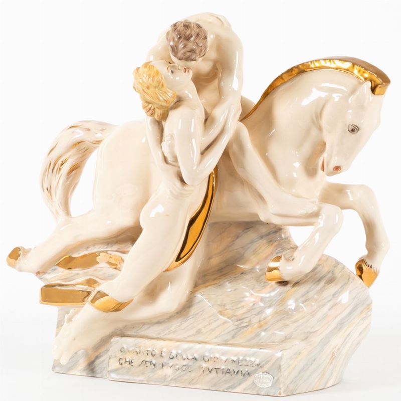 Figura di uomo e donna a cavallo in ceramica policroma con dorature.
