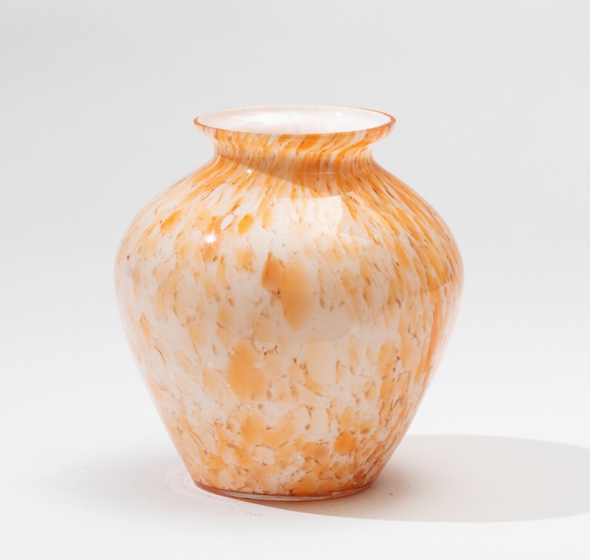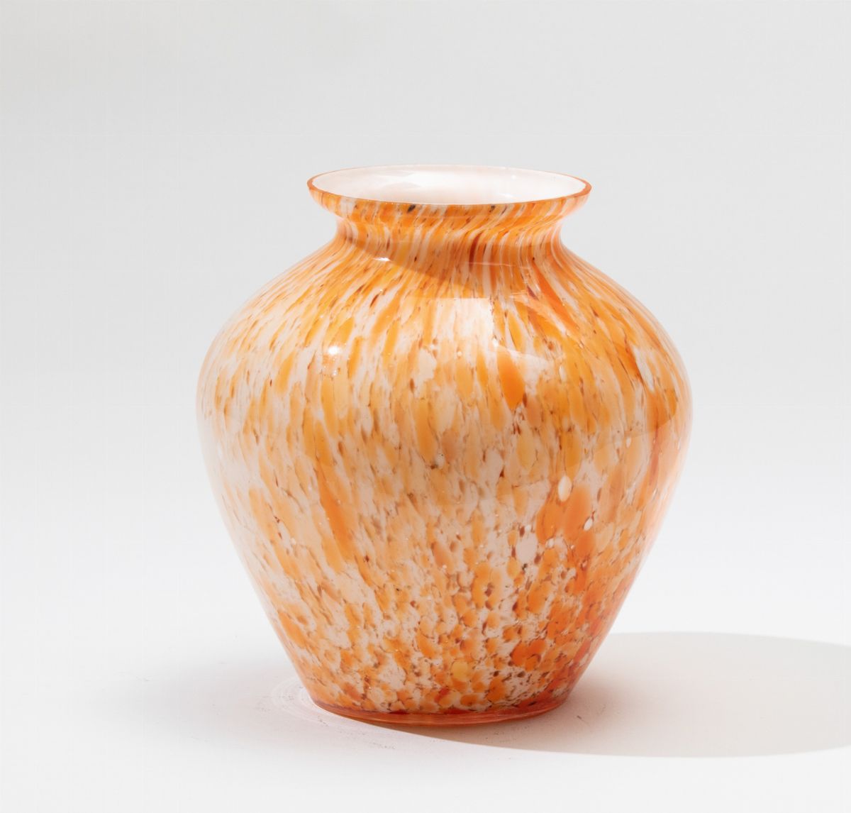 Vaso in vetro incamiciato con decoro a macchie sui toni dell’arancio.