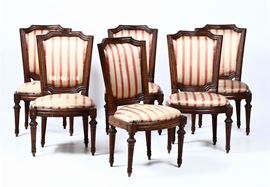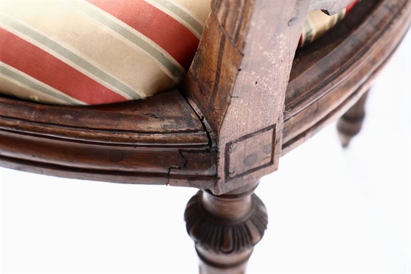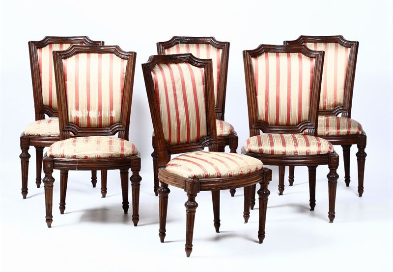 Sei sedie Luigi XVI in noce intagliato, fine XVIII secolo