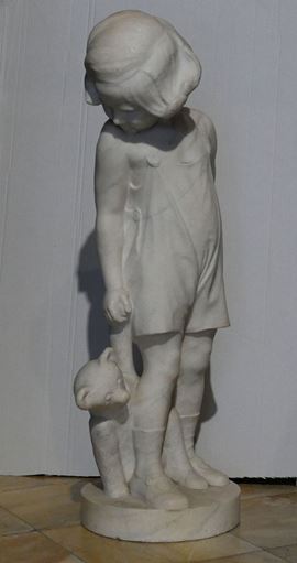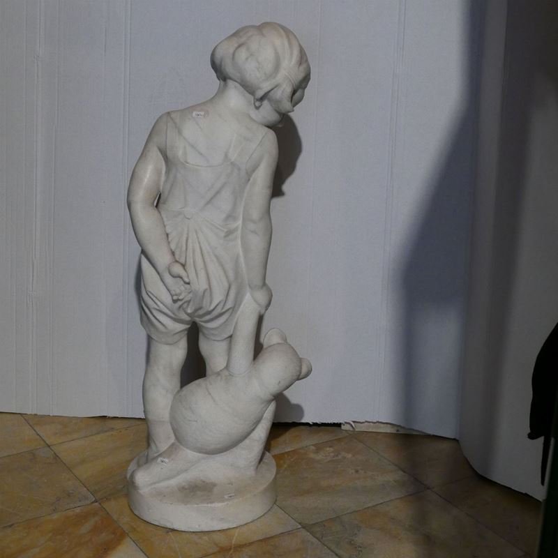 Statua in marmo raffigurante bimba con orsacchiotto, inizi XX secolo, firma di difficile lettura alla base