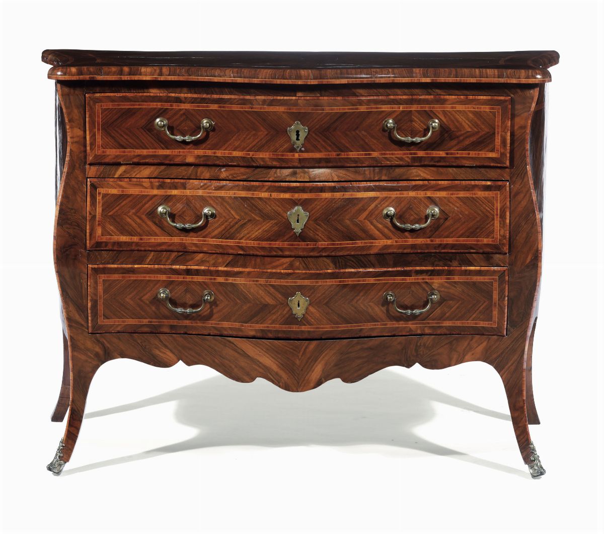 Cassettone Luigi XV a tre cassetti lastronato e filettato, Napoli XVIII secolo