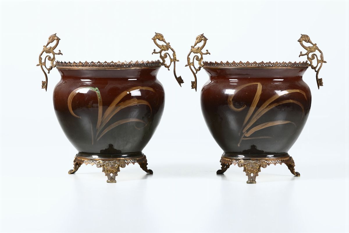 Coppia di vasi in ceramica a decoro floreale su fondo rosso, montatura in bronzo, XX secolo