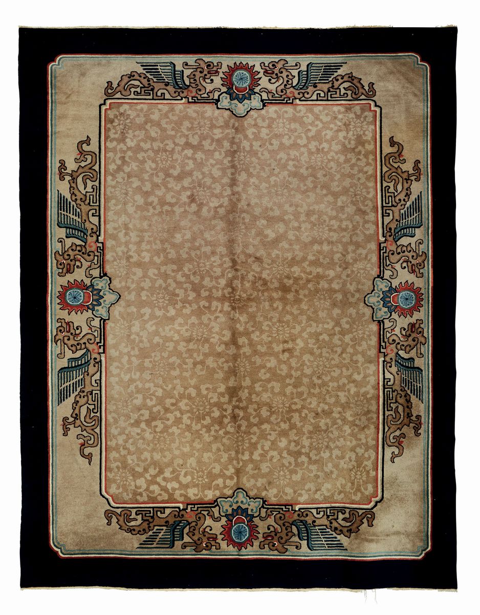 campo beige con ramage di foglie e fiori di Peonie, bordura principale beige con draghi secondaria marrone cm 358x250