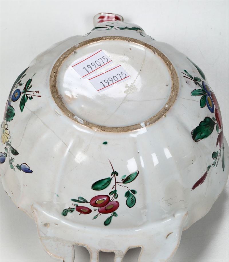 Maiolica policroma a piccolo fuoco. Altezza cm 8; 21,5 x 14,2. Rotta in alcuni frammenti e ricomposta in restauro