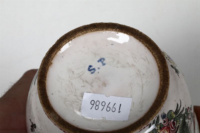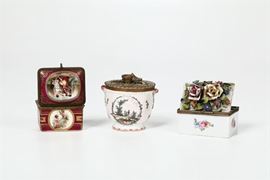 Il calamaio con decorazione policroma ispirata alle maioliche marsigliesi settecentesche ha la copertura in metallo. Le due scatoline sono riconducibili a modelli di Meissen - quella a fiori - e a Vienna per quella a fondo rosso porpora