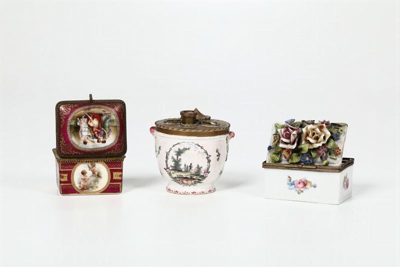 Un calamaio in maiolica e due scatoline in porcellana. XIX-XX secolo