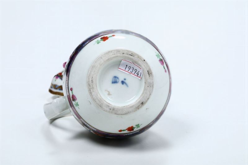 Porcellana. Marca: scudo in blu; “28” in porpora; “75” inciso. Altezza cm 15,4. Coperchio restaurato e felatura al corpo