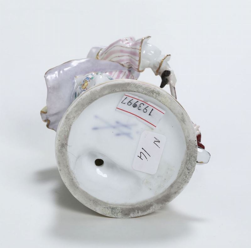 Porcellana policroma. Marca: spade e punto, in blu. Altezza cm 15. Ottimo stato; una parte dell’archetto mancante