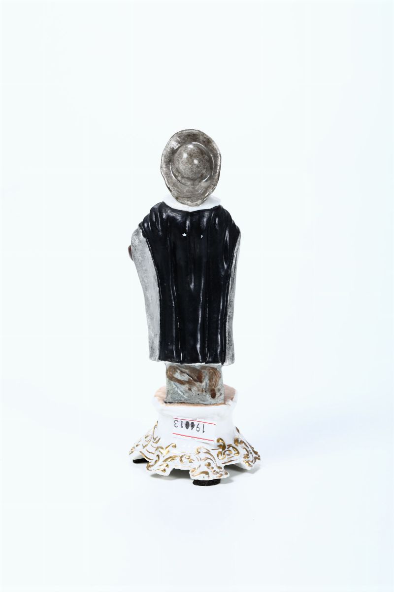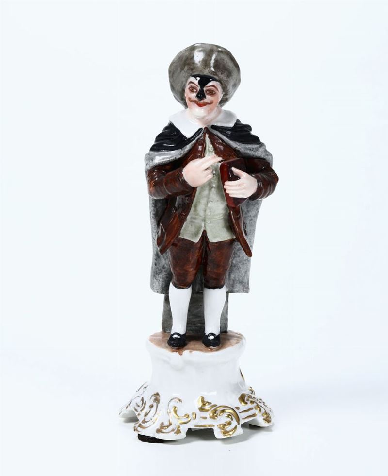 Su base a rocaille vi è raffigurato il Dottore, personaggio della Commedia dell’Arte