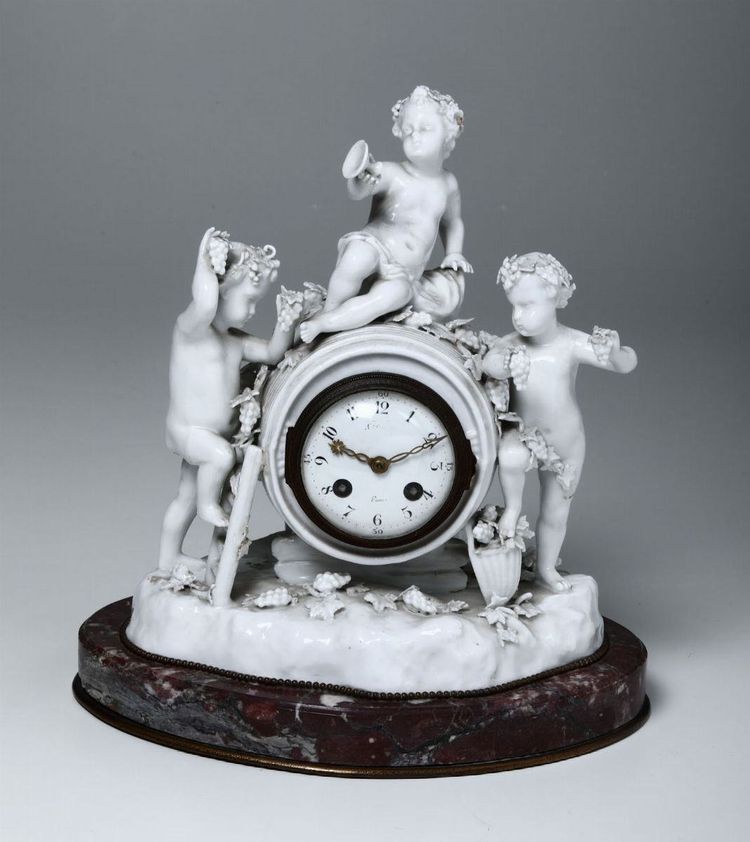 Montato su base in marmo raffigura una botte, nella quale è inserito l’orologio, con tre putti quale allegoria dell’Autunno