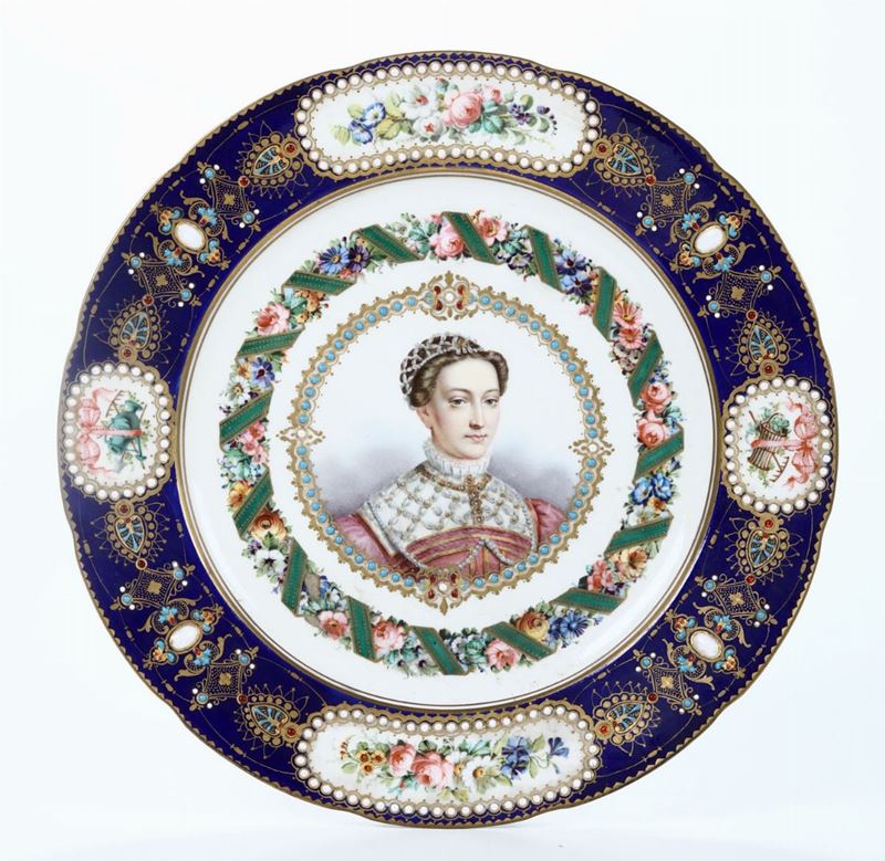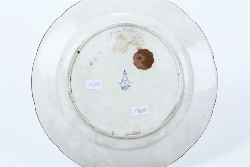Porcellana. Marca: marca di Sèvres con due “L” intrecciate e lettera “C”; “Jeanne D’Abret.” in blu. Diametro cm 24,5. Ottimo stato di conservazione