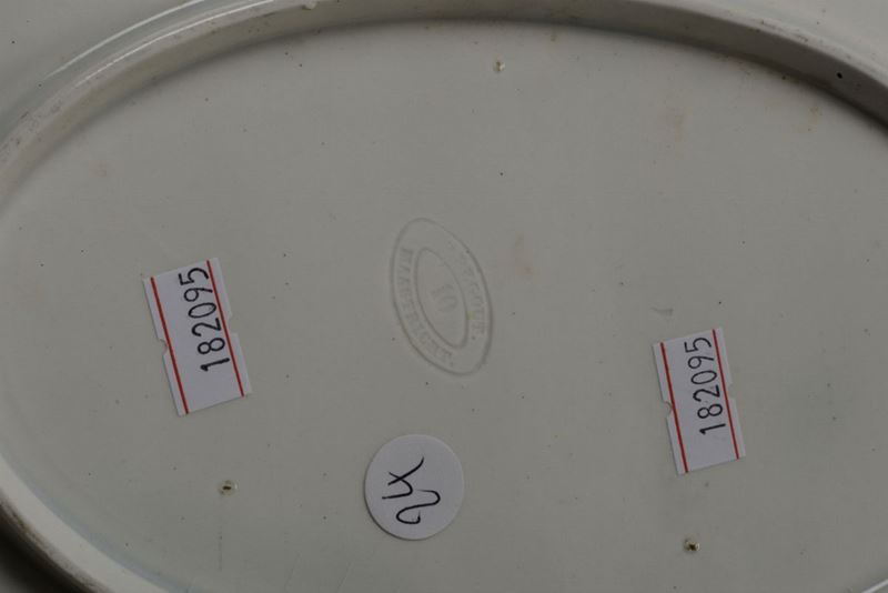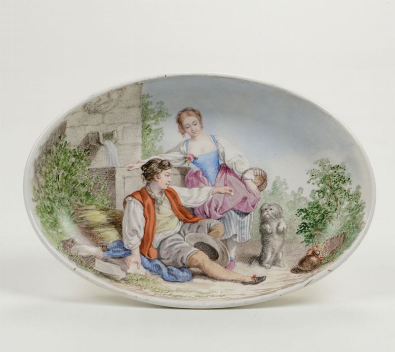 Il piatto ovale é dipinto in policromia sull'intera superficie interna con una scena galante: due pastorelli in abiti settecenteschi sono accompagnati da un cagnolino