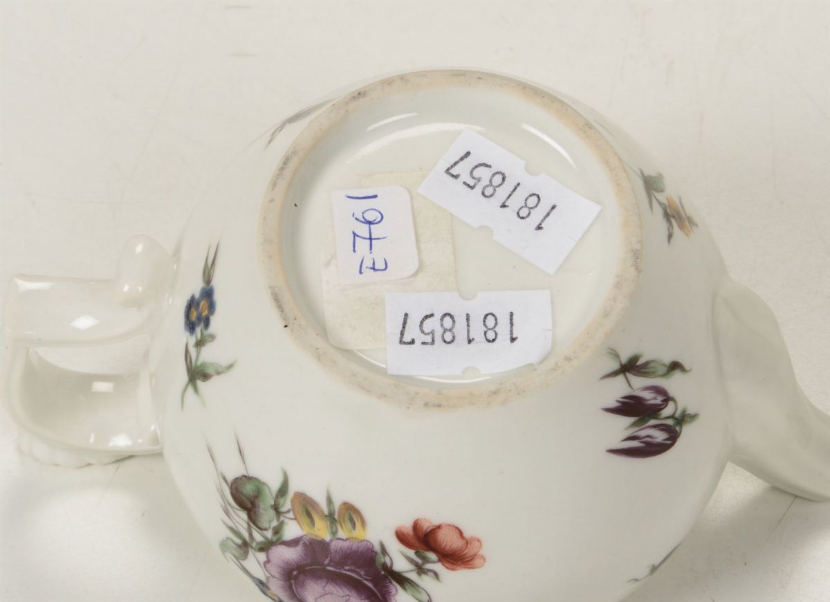 La forma di questa teiera è piuttosto rara. Il caratteristico manico con la piccola conchiglia lo troviamo in alcuni esemplari del primissimo periodo della manifattura ed è ispirato da manici già in uso a Meissen
