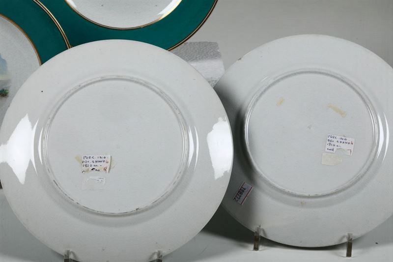 Porcellana. Marca: impressa indecifrabile. Diametro cm 23. Ottimo stato, due insignificanti difetti di cottura al bordo di due piatti