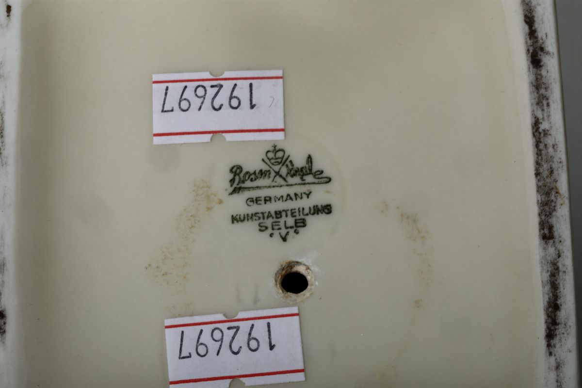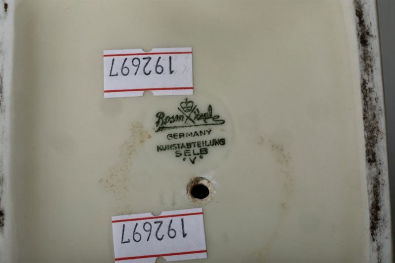 Porcellana biscuit (testa); porcellana smaltata (base). Marca: “Rosenthal” coronata tra due bastoni incrociati e “Germany Kunstabteilung Selb V”, in verde. Altezza cm 29. Ottimo stato