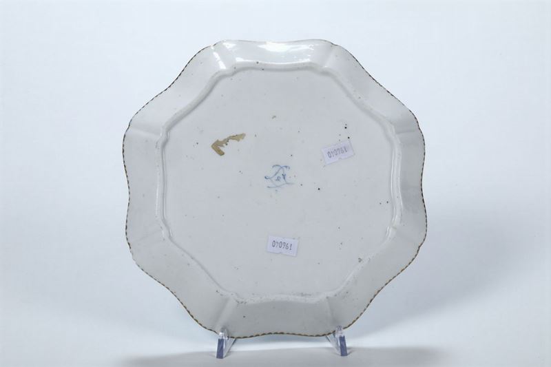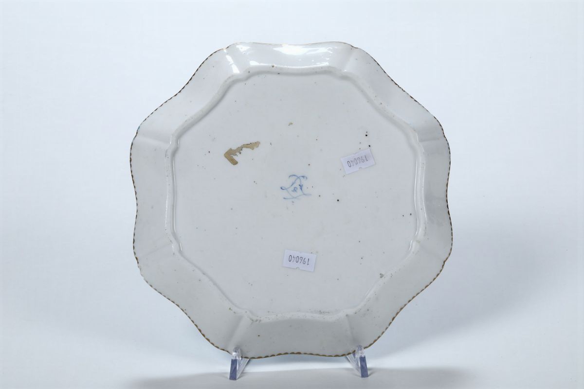 Porcellana tenera. Marca: due “L” intrecciate e lettera “R” in blu. Diametro cm 23,5. Due piccole sbeccature al bordo, usure all’oro