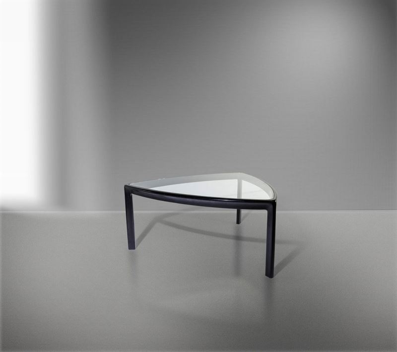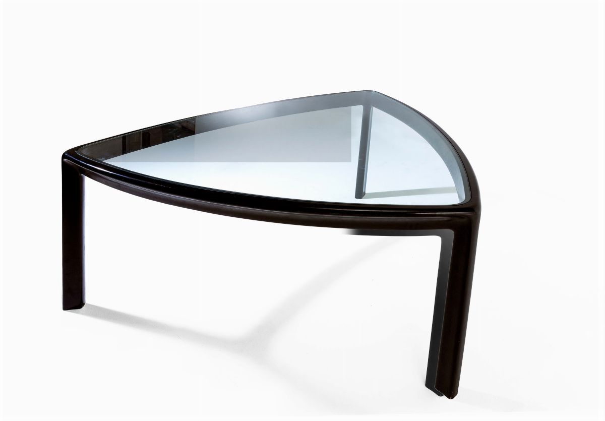 Grande tavolo con struttura in legno e piano in vetro.