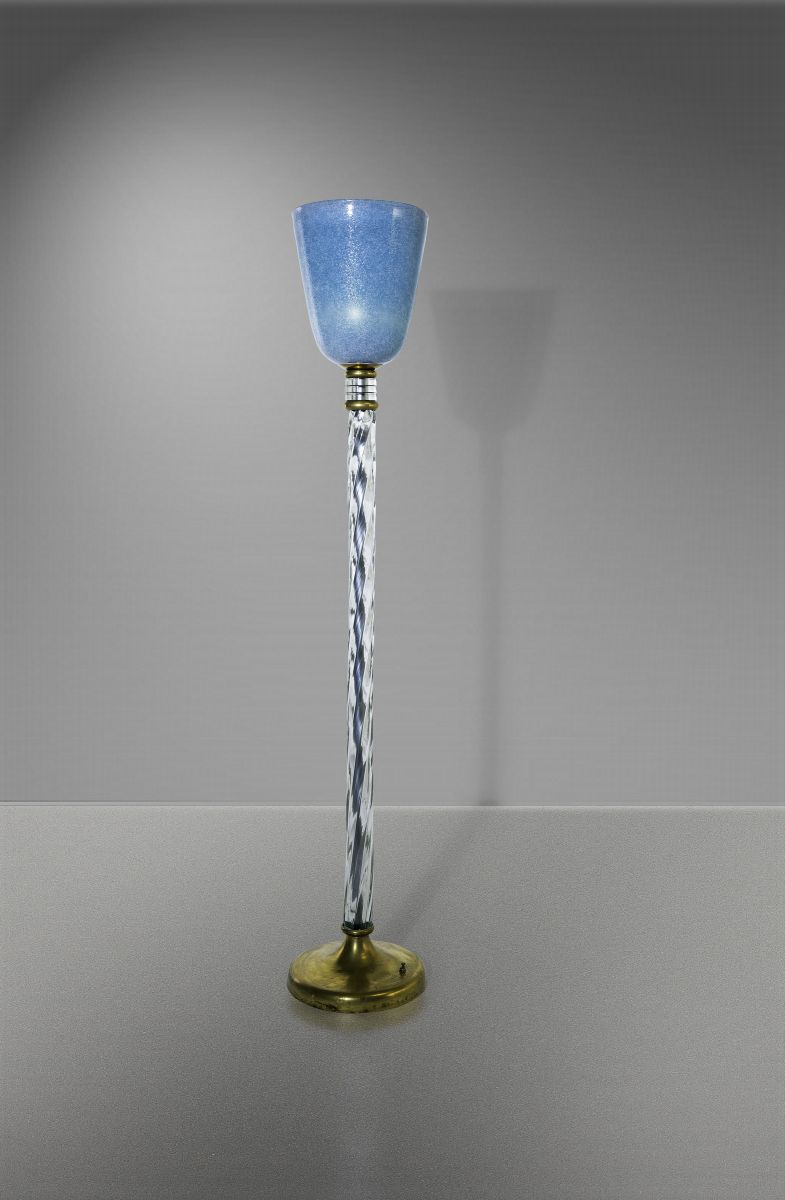 Lampada da terra con struttura in ottone, metallo e vetro di Murano a torchon. Diffusore in vetro a bollicine.